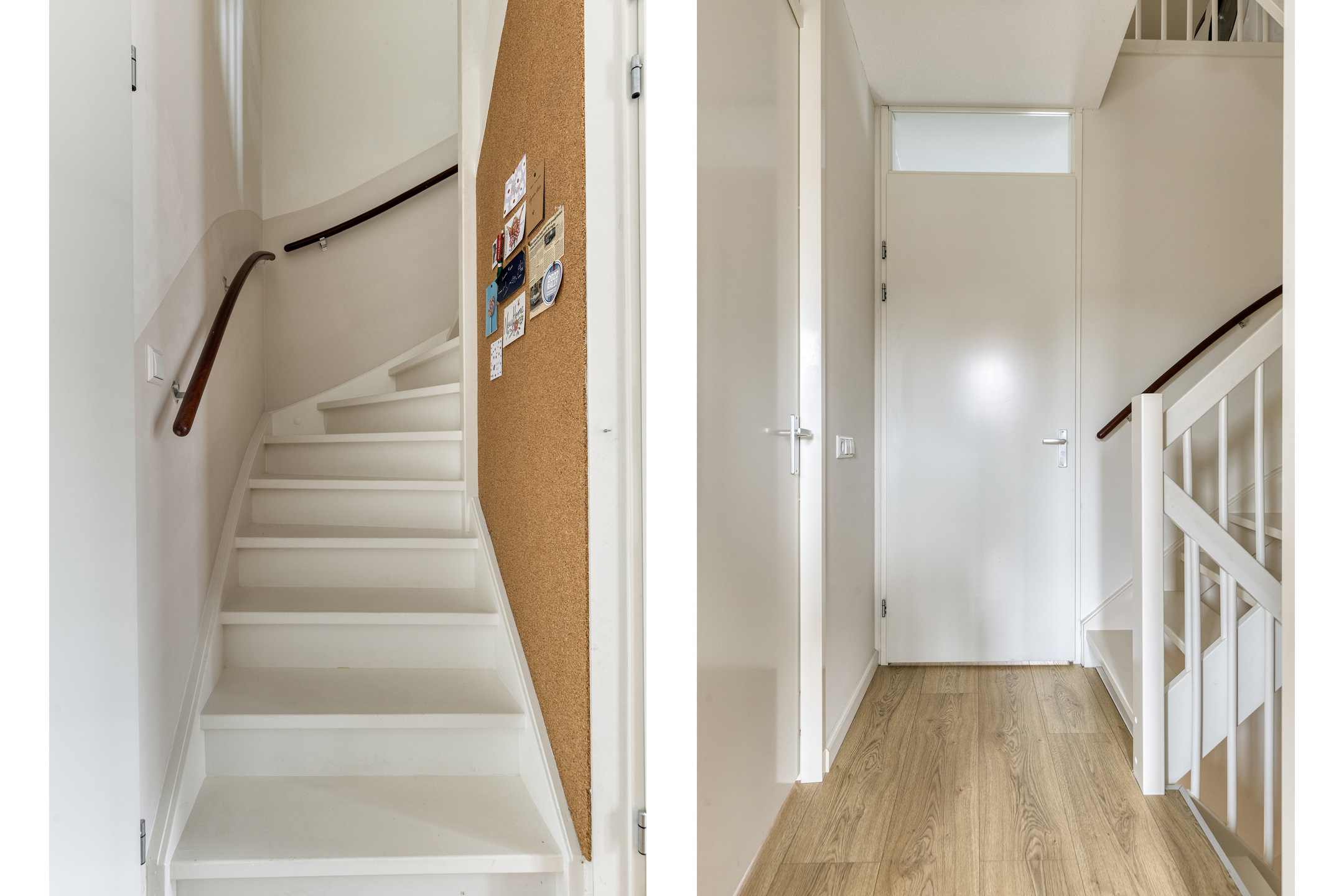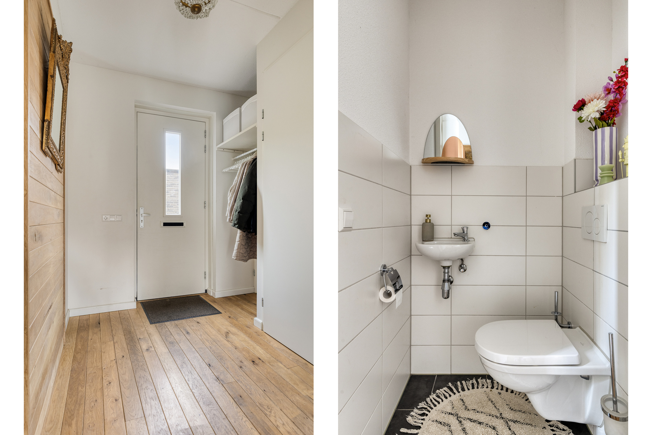 Entree/hal met meterkast, toilet met fontein (halfhoog betegeld). Aan de voorzijde ligt de keuken met uitzicht over het hofje. De keuken is uitgerust met een 4-pits inductiekookplaat, vaatwasser, combi-oven/magnetron, afzuigkap en koelkast. Vanuit de woonkamer bereikt u ook de trapkast.