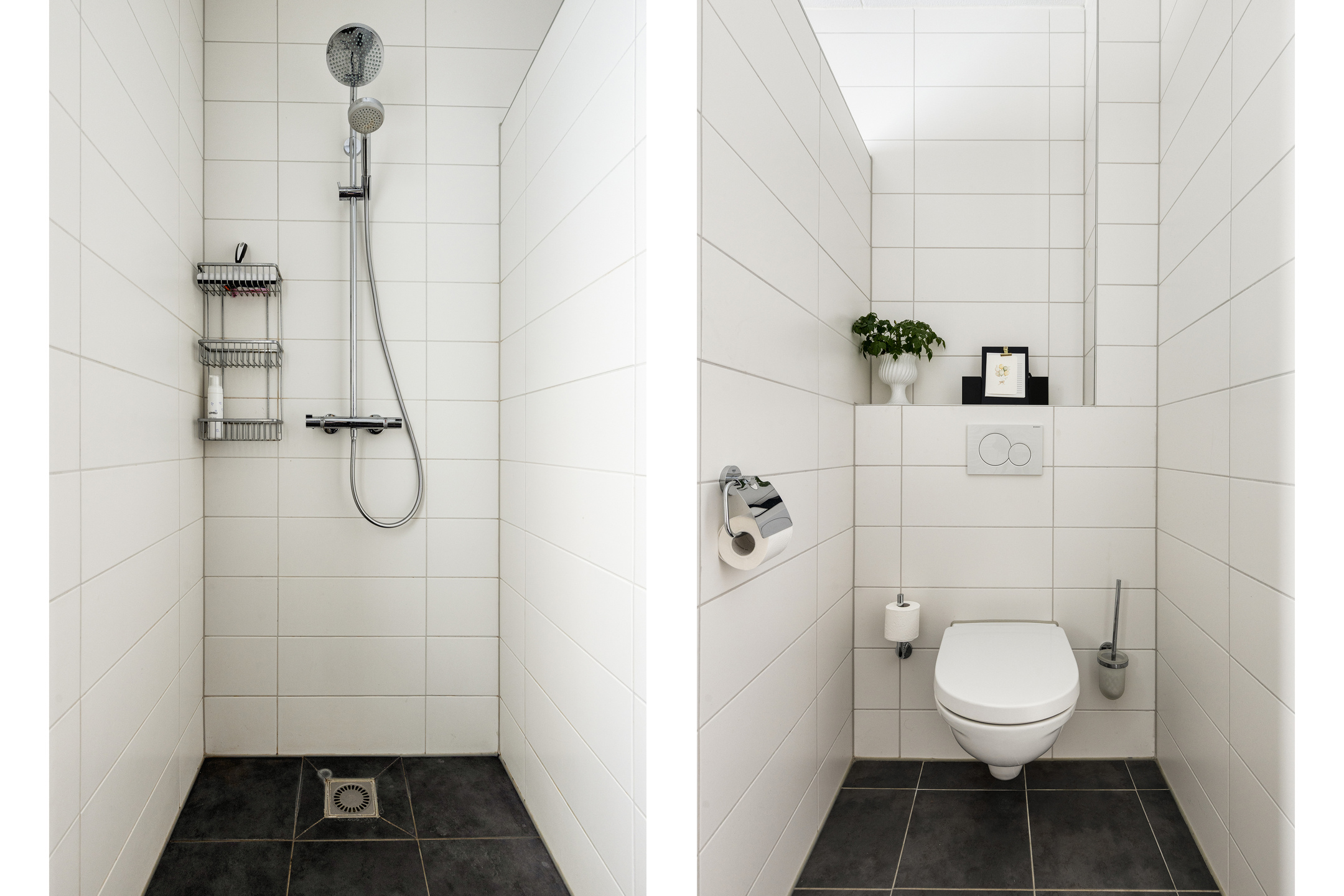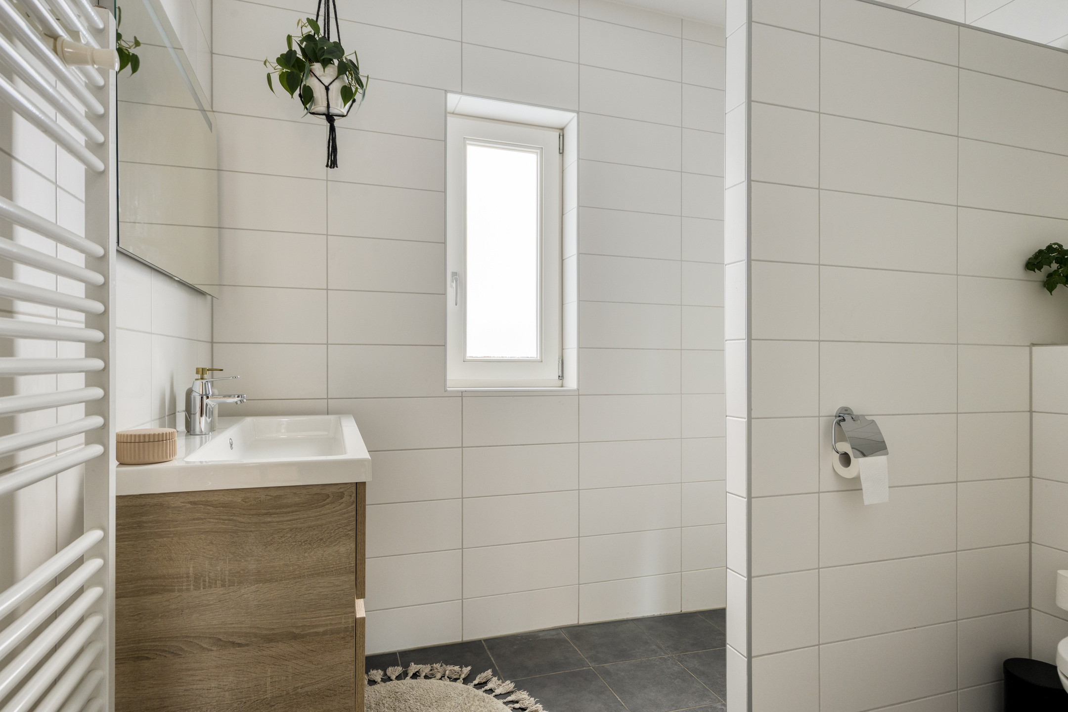 De badkamer aan de voorzijde is volledig betegeld en voorzien van inloopdouche, wastafelmeubel, toilet en designradiator.