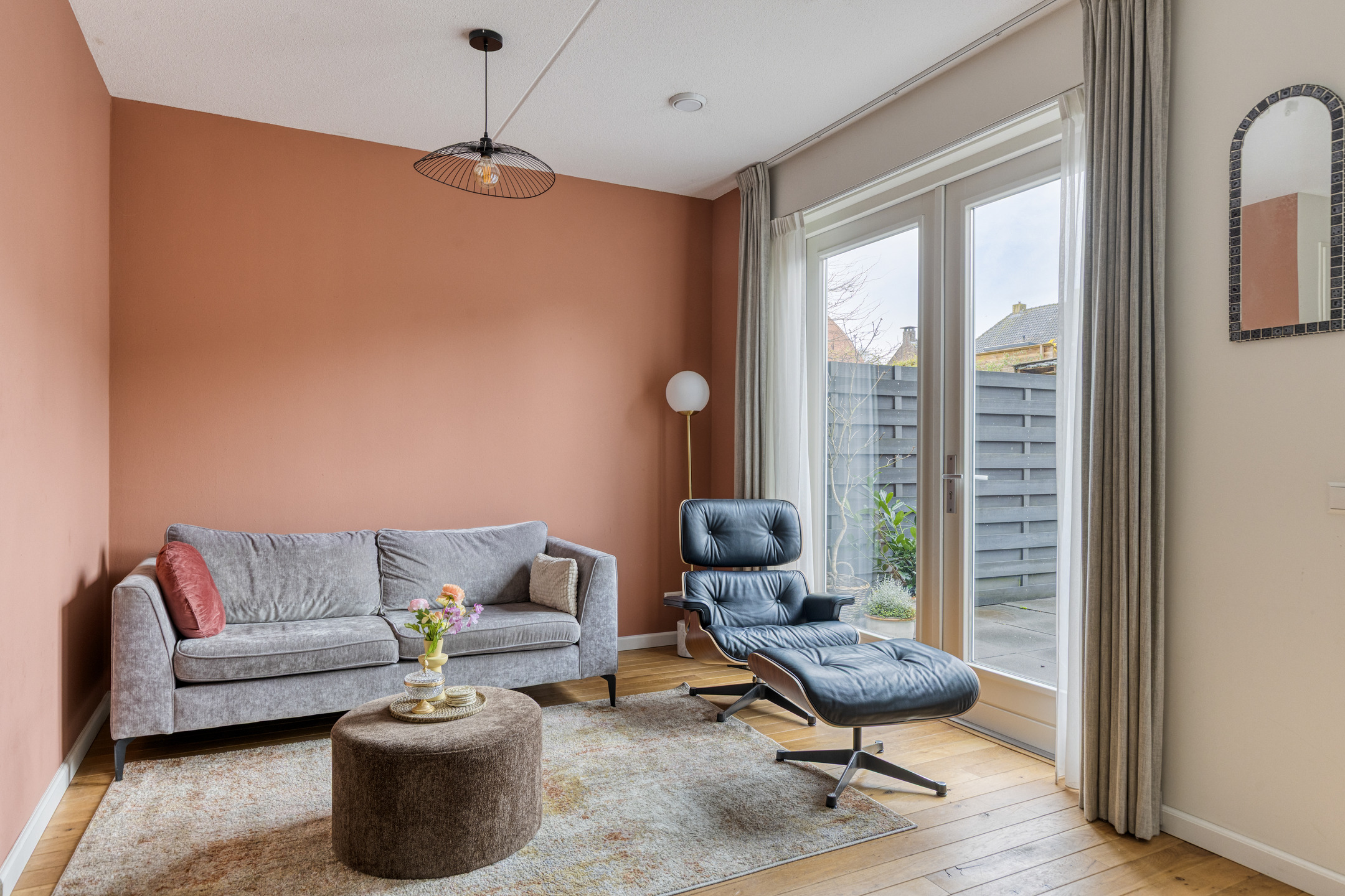 De woonkamer is een lichte en prettige leefruimte met houten vloer, strak gestucte wanden en plafonds met spuitwerk. Via de tuindeuren en een enkele deur is er directe toegang tot de achtertuin.
