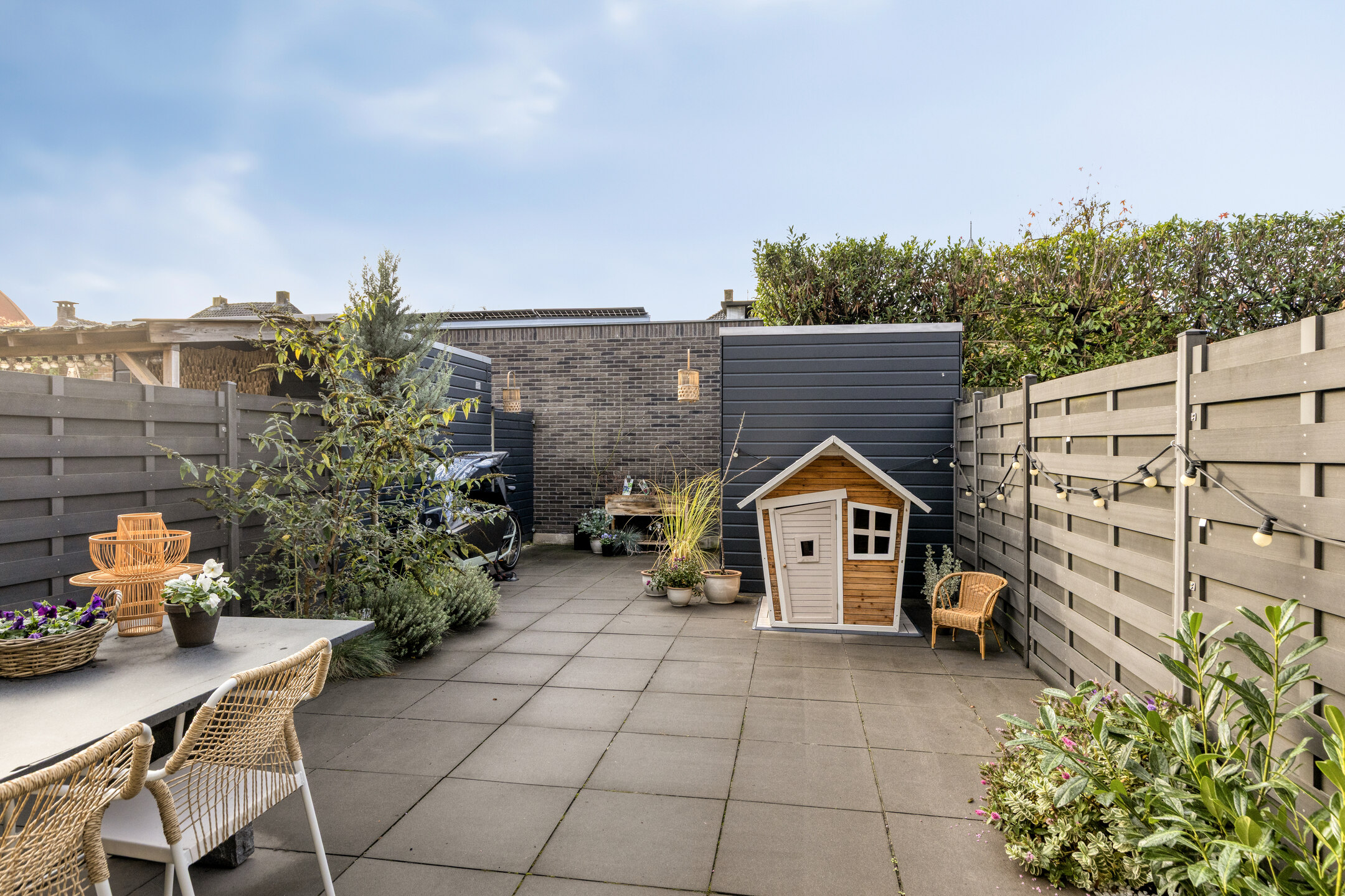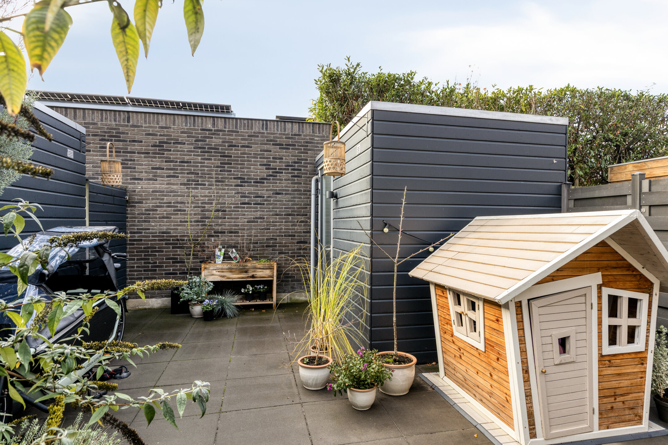 De tuin is verzorgd aangelegd met tegelbestrating, plantenborders en een buitenkraan. Achterin staat een houten schuur voorzien van elektra.