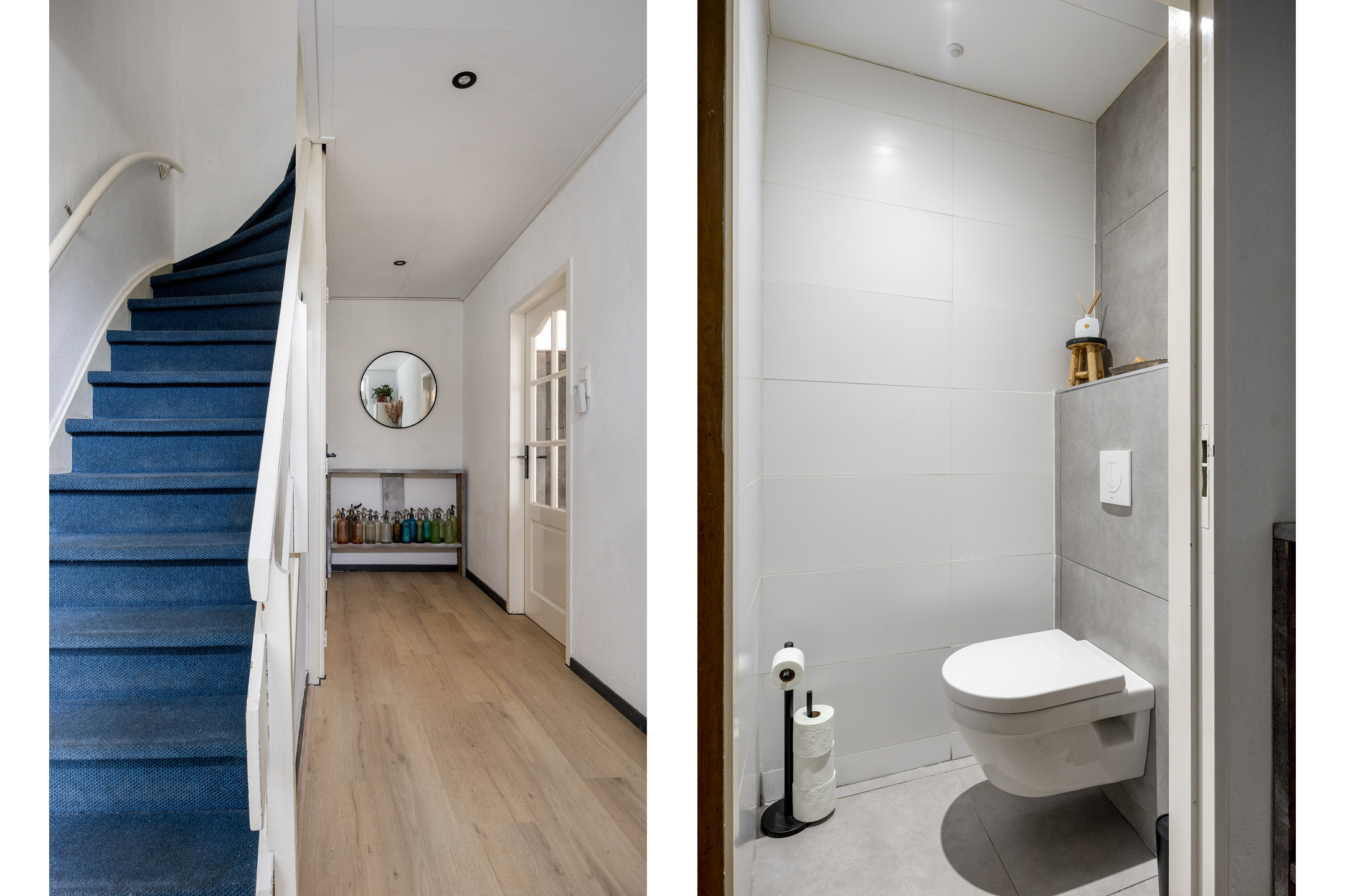 Ruime entree/hal met trapopgang naar de eerste verdieping, meterkast (5 groepen, 2 aardlekschakelaars), trapkast en toilet (2022 verbouwd). De woonkamer aan de voorzijde is voorzien van een houtkachel, strak stucwerk op het plafond en korrelafwerking op de wanden, een pvc vloer. Aan de achterzijde bevindt zich de keuken, uitgevoerd met 4-pits inductiekookplaat, vaatwasser, koelkast, vriezer, combi-oven/magnetron en RVS-afzuigkap. Vanuit de keuken is er directe toegang tot de achtertuin.