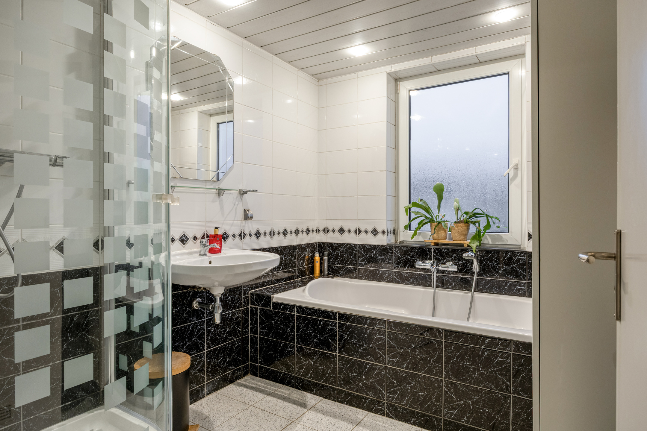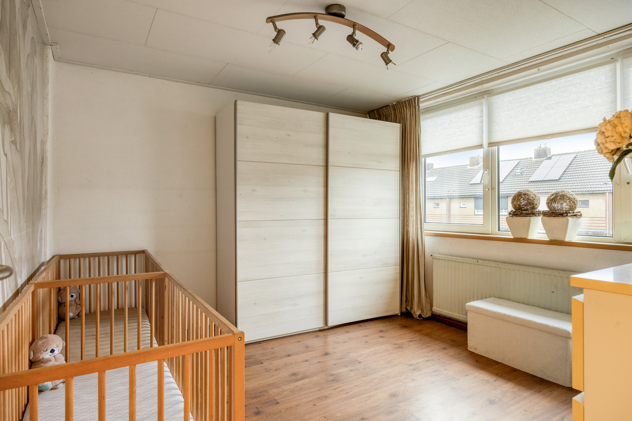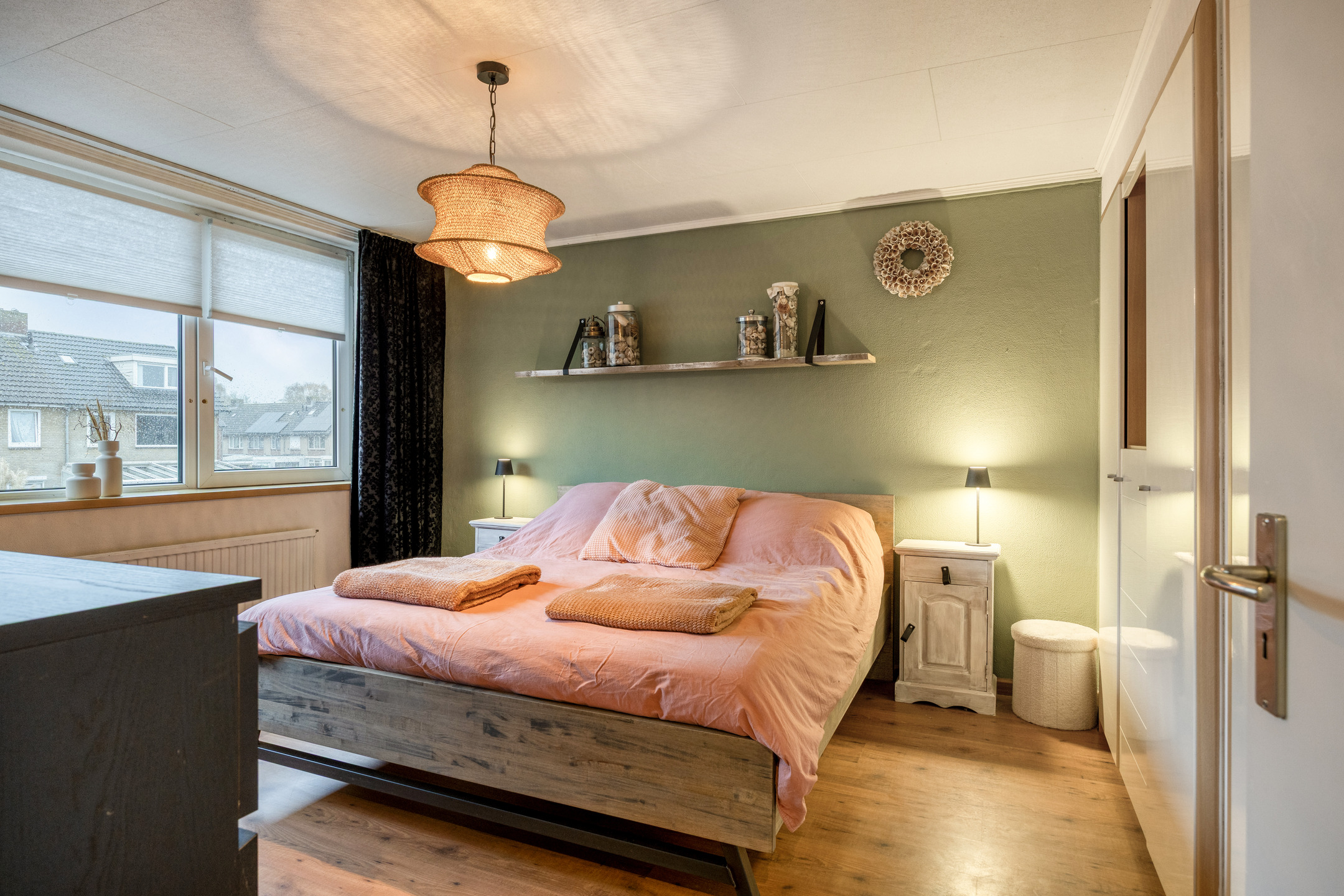 Overloop met toegang tot twee slaapkamers, de badkamer, een wasruimte en het toilet op de overloop. De voormalige badkamer is omgebouwd tot wasruimte. De ruime badkamer aan de achterzijde beschikt over ligbad, douchecabine en wastafel. De hoofdslaapkamer aan de achterzijde is voorzien van inbouwkasten en de slaapkamer aan de voorzijde is eveneens ruim. Alle kamers zijn afgewerkt met laminaatvloeren, plafondbeplating, stucwerk of behang op de wanden.