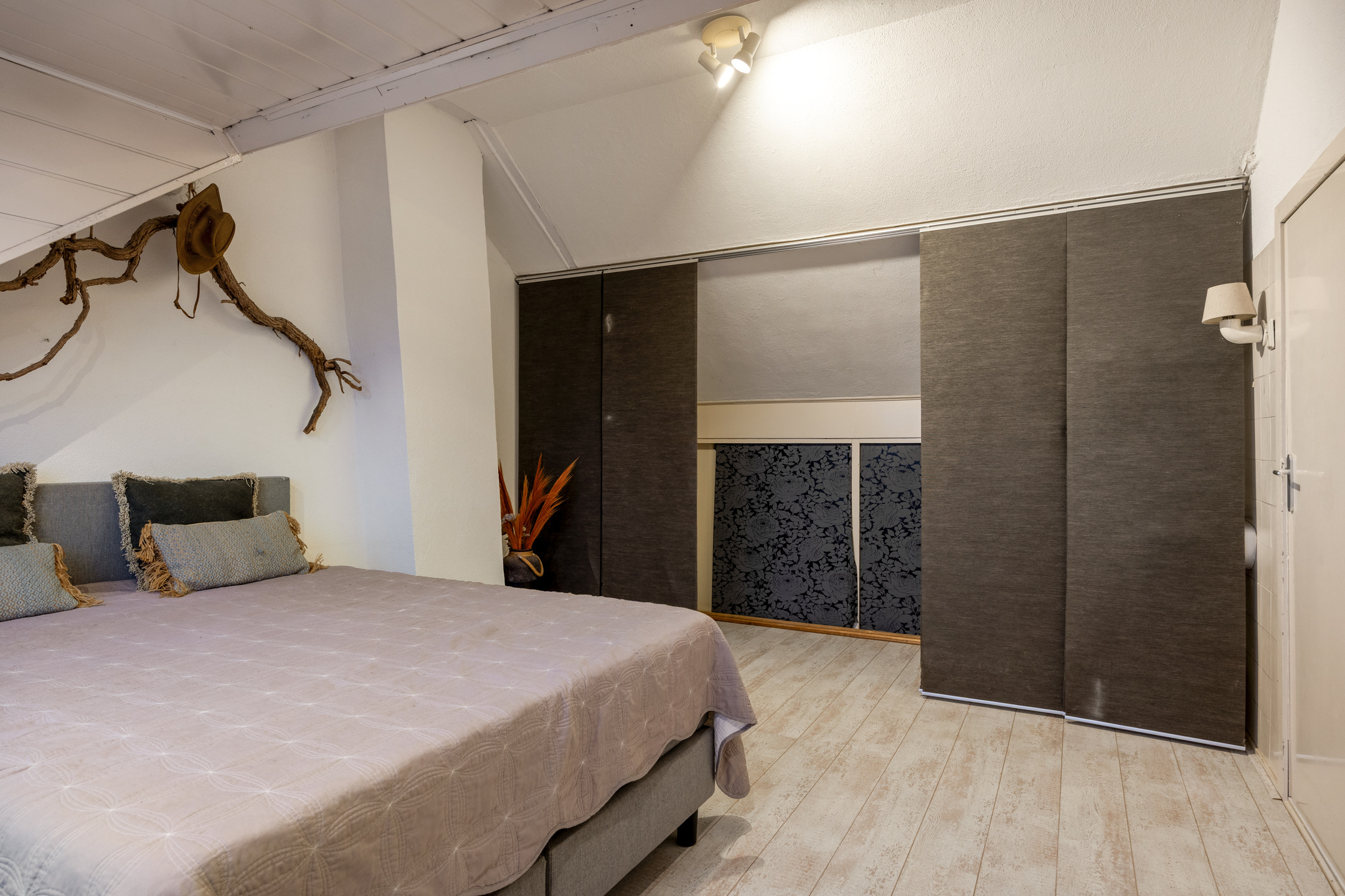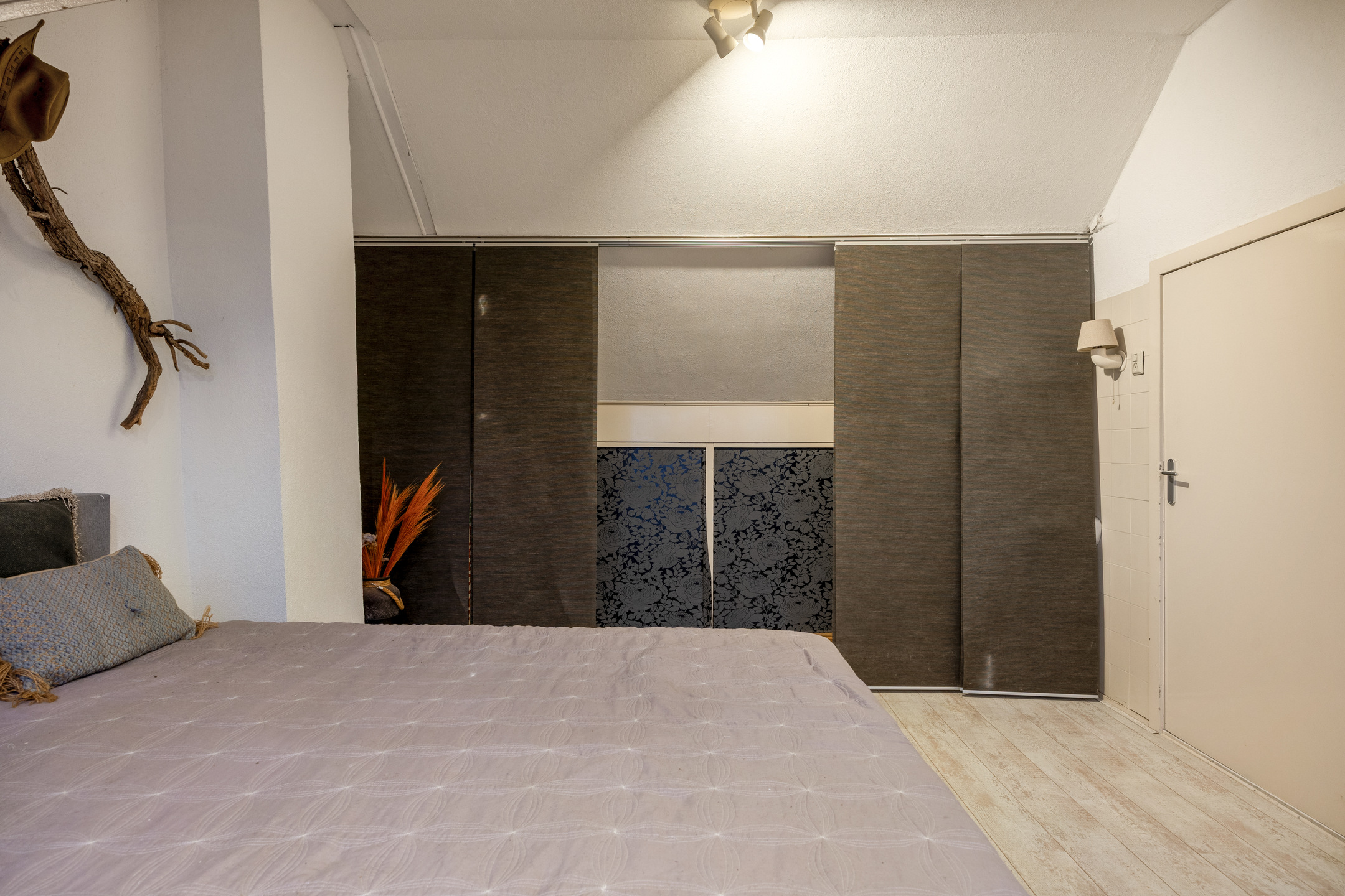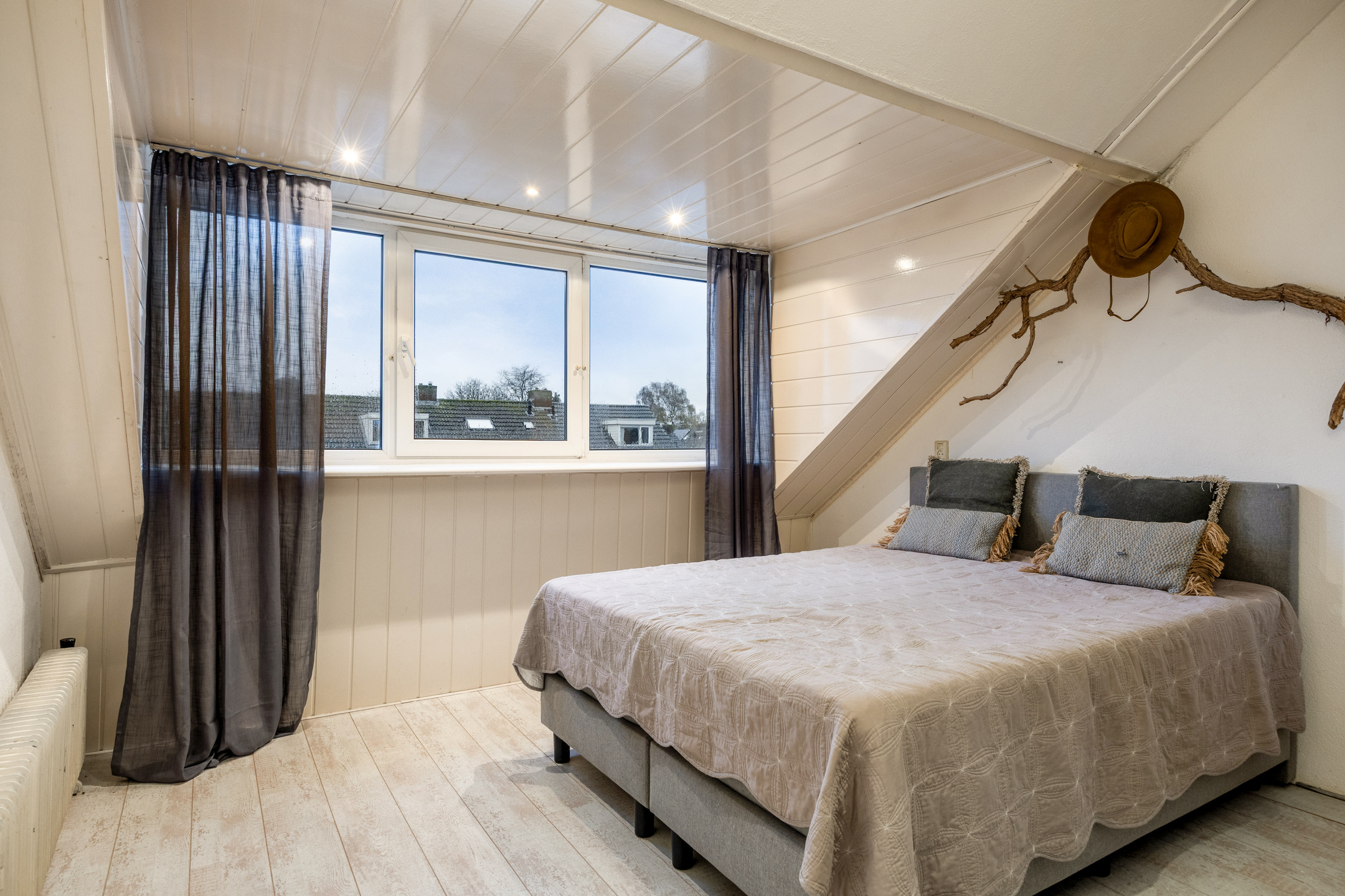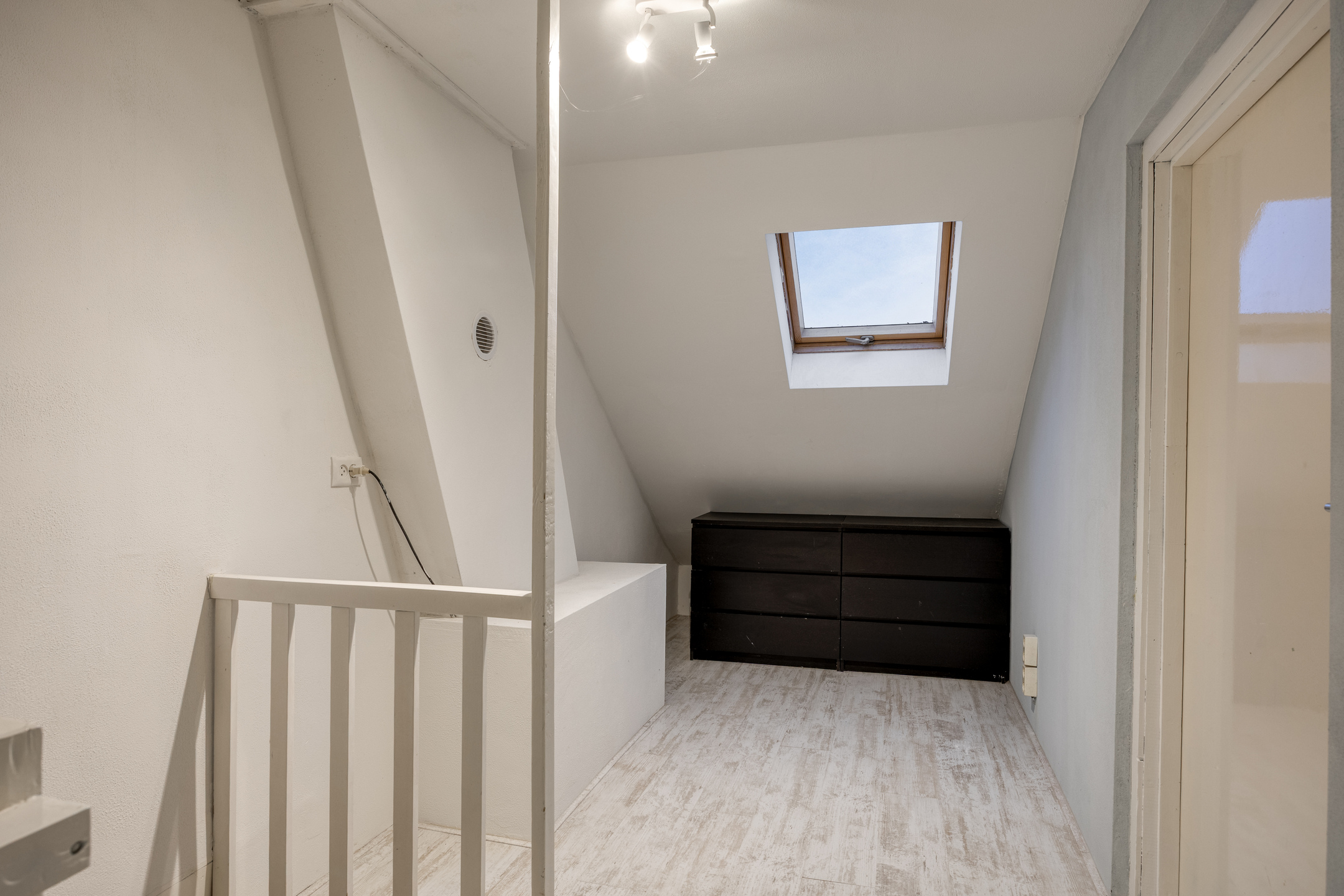 Zolderverdieping met dakkapel, laminaatvloer en hellend dak met fijne korrel op de wanden. De voorzolder biedt plek voor de CV-ketel en heeft een dakraam voor extra lichtinval.