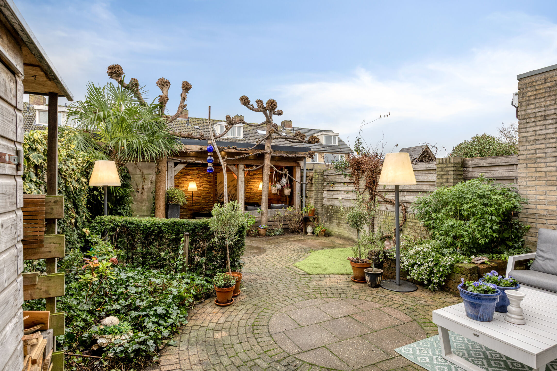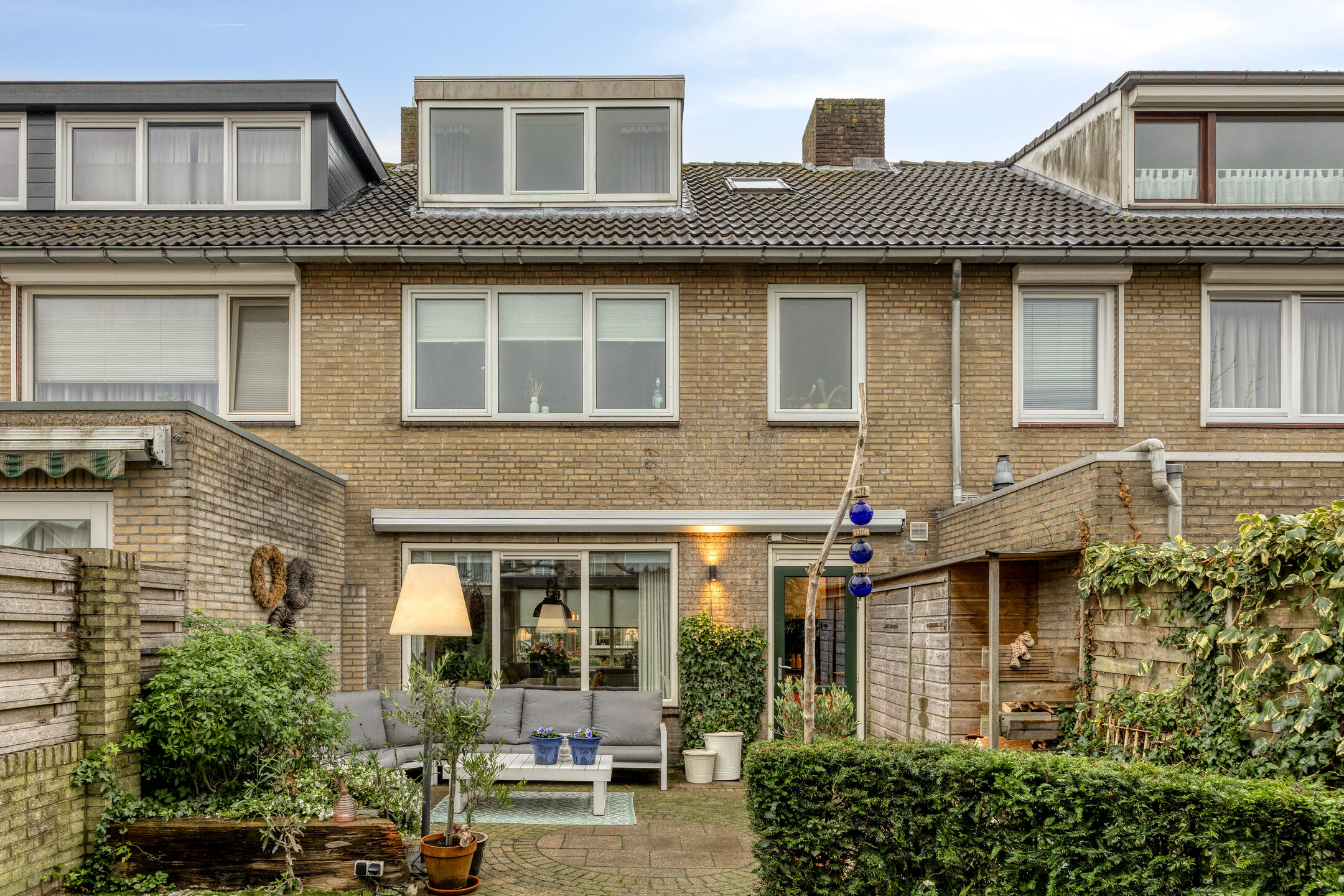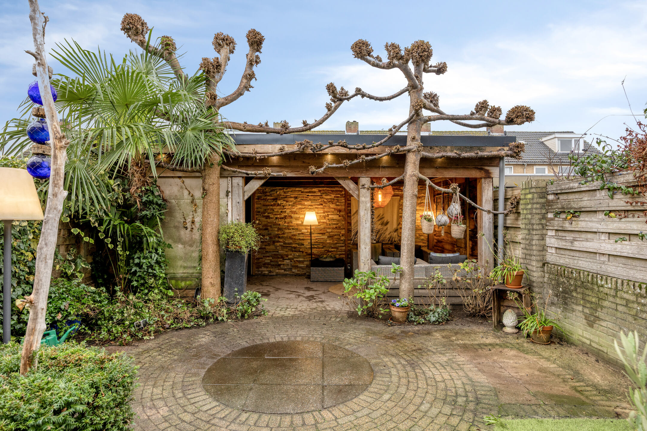 De verzorgde achtertuin is voorzien van klinkerbestrating, kunstgras, plantenborders, een tuinkast en een buitenkraan. Een zonnescherm aan de achtergevel en een veranda maken het geheel compleet. Achterin de tuin staat een gemetselde berging met poort naar de achtergelegen gang. Voor de veranda zijn fraaie lei-linden geplant.