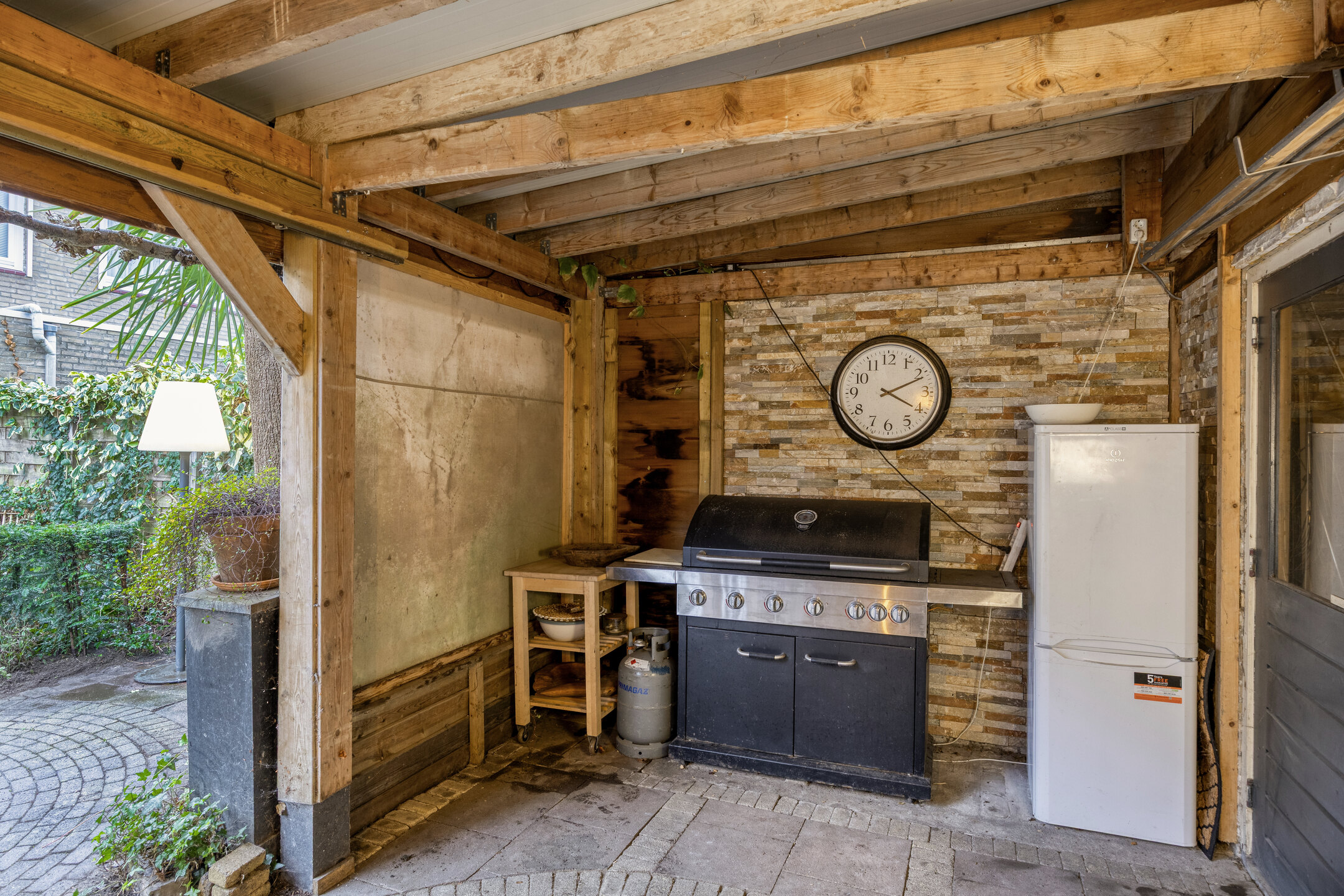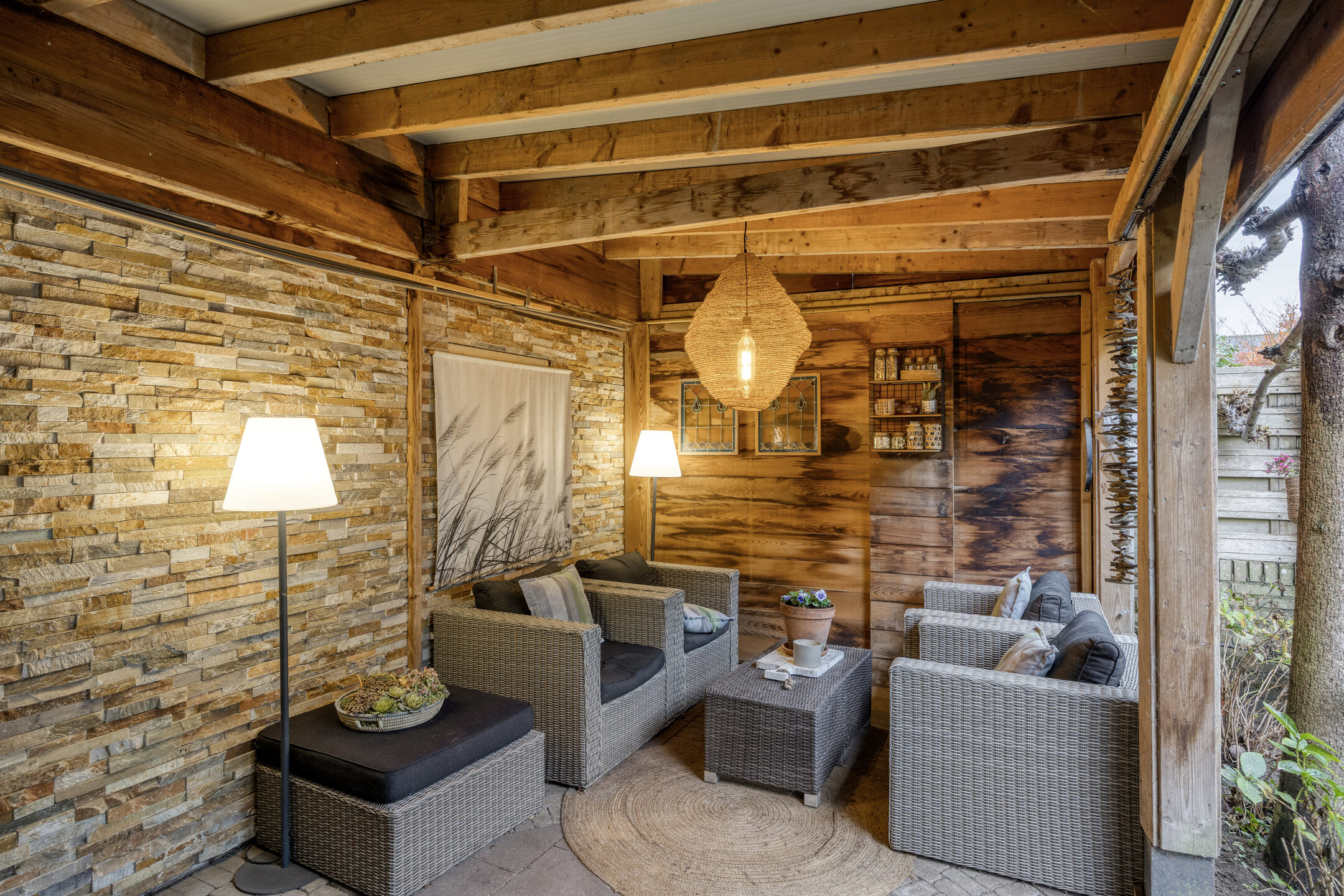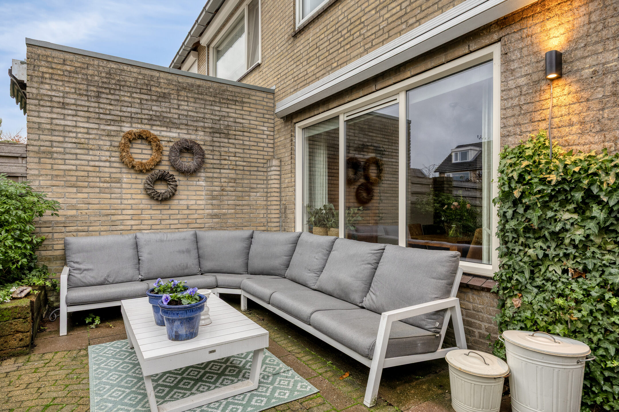 De verzorgde achtertuin is voorzien van klinkerbestrating, kunstgras, plantenborders, een tuinkast en een buitenkraan. Een zonnescherm aan de achtergevel en een veranda maken het geheel compleet. Achterin de tuin staat een gemetselde berging met poort naar de achtergelegen gang. Voor de veranda zijn fraaie lei-linden geplant.