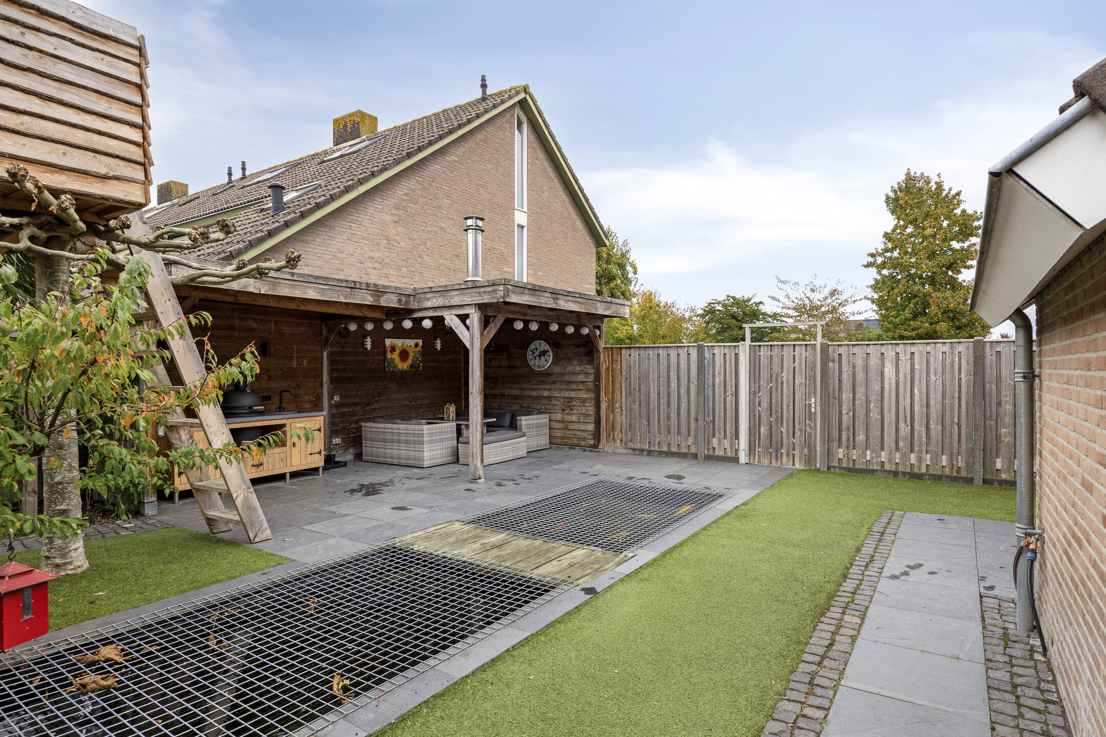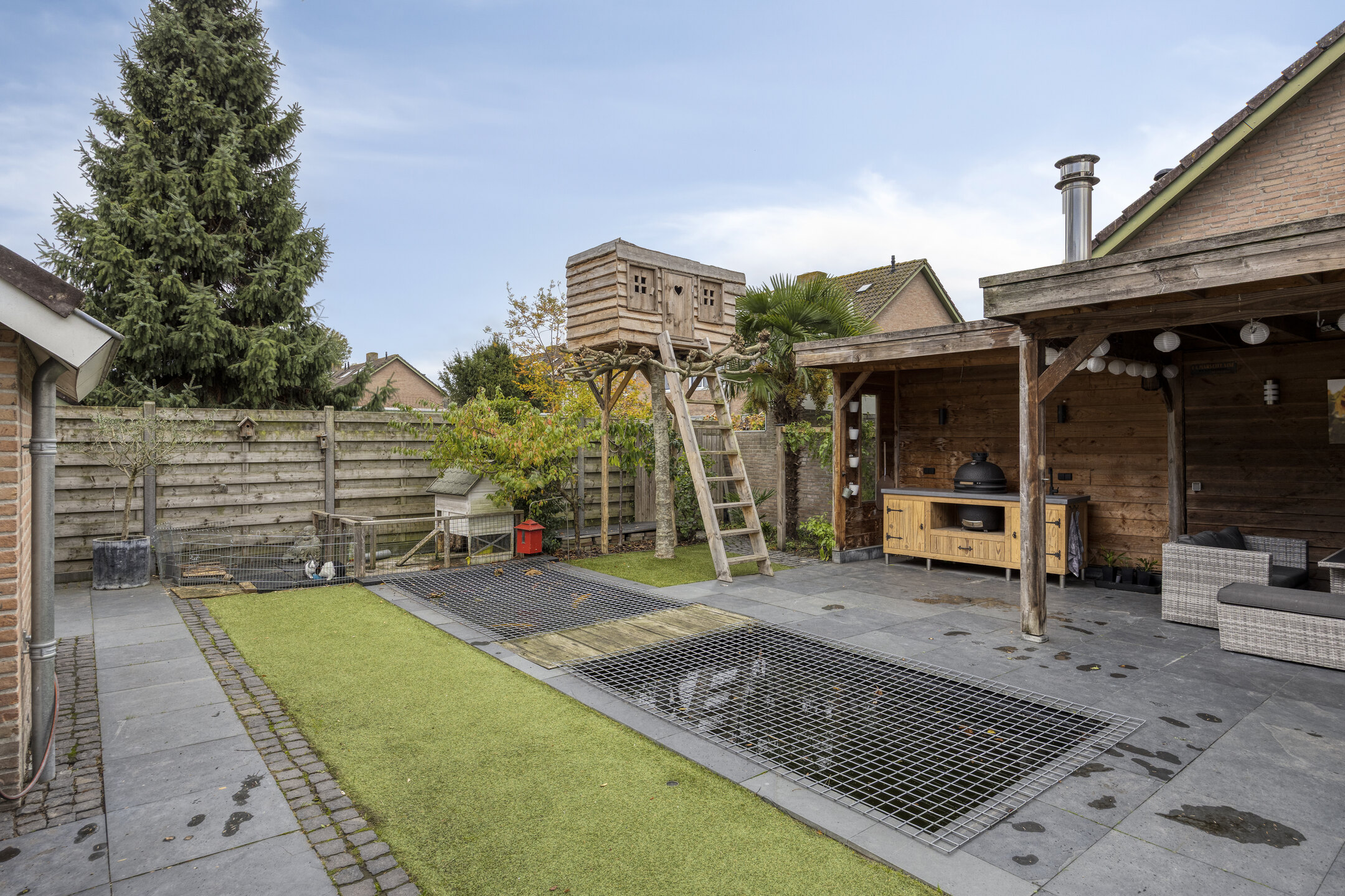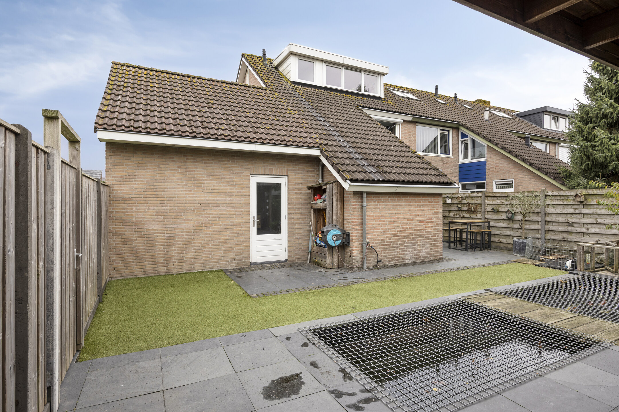 De achtertuin is verzorgd aangelegd en bereikbaar via openslaande tuindeuren. Achterin bevindt zich de in 2014 gebouwde garage met carport, volledig geïsoleerd en voorzien van elektrische sectionaaldeur.