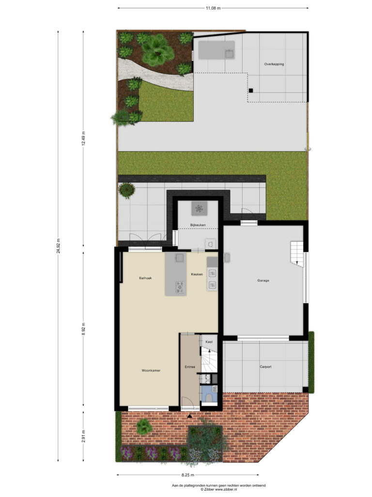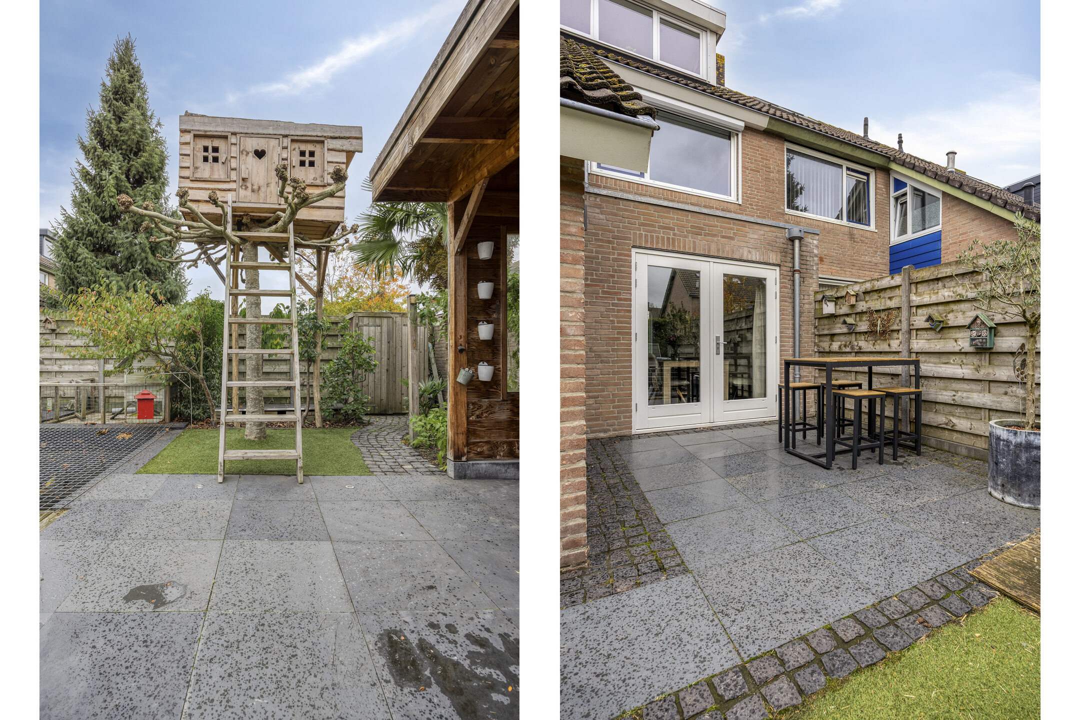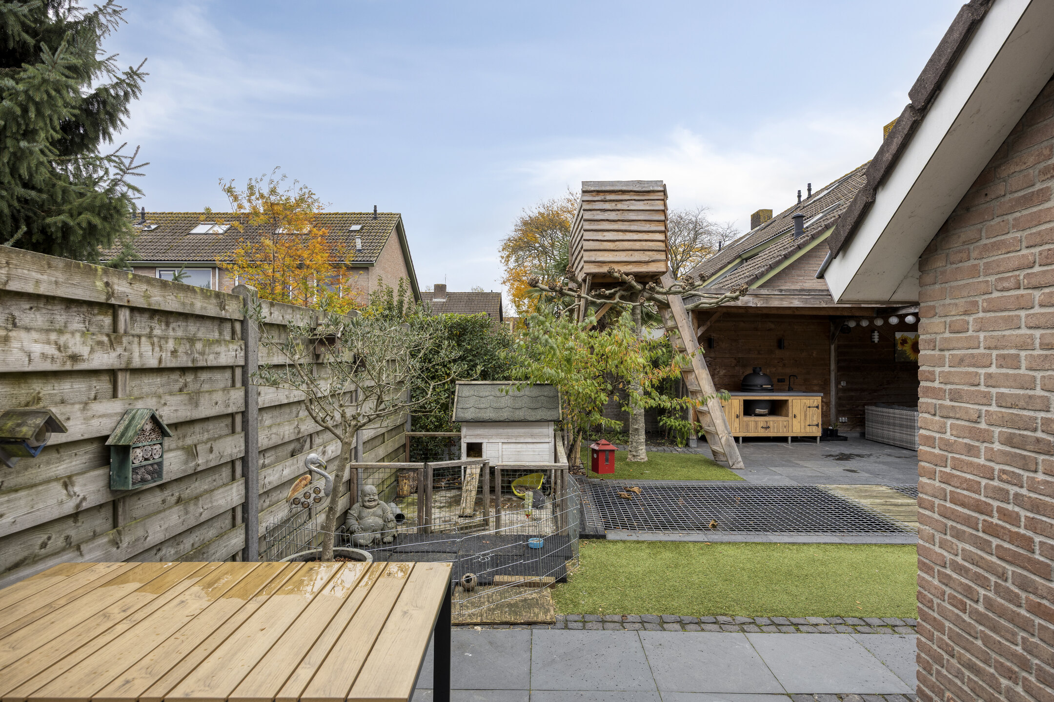 De achtertuin is verzorgd aangelegd en bereikbaar via openslaande tuindeuren. Achterin bevindt zich de in 2014 gebouwde garage met carport, volledig geïsoleerd en voorzien van elektrische sectionaaldeur.