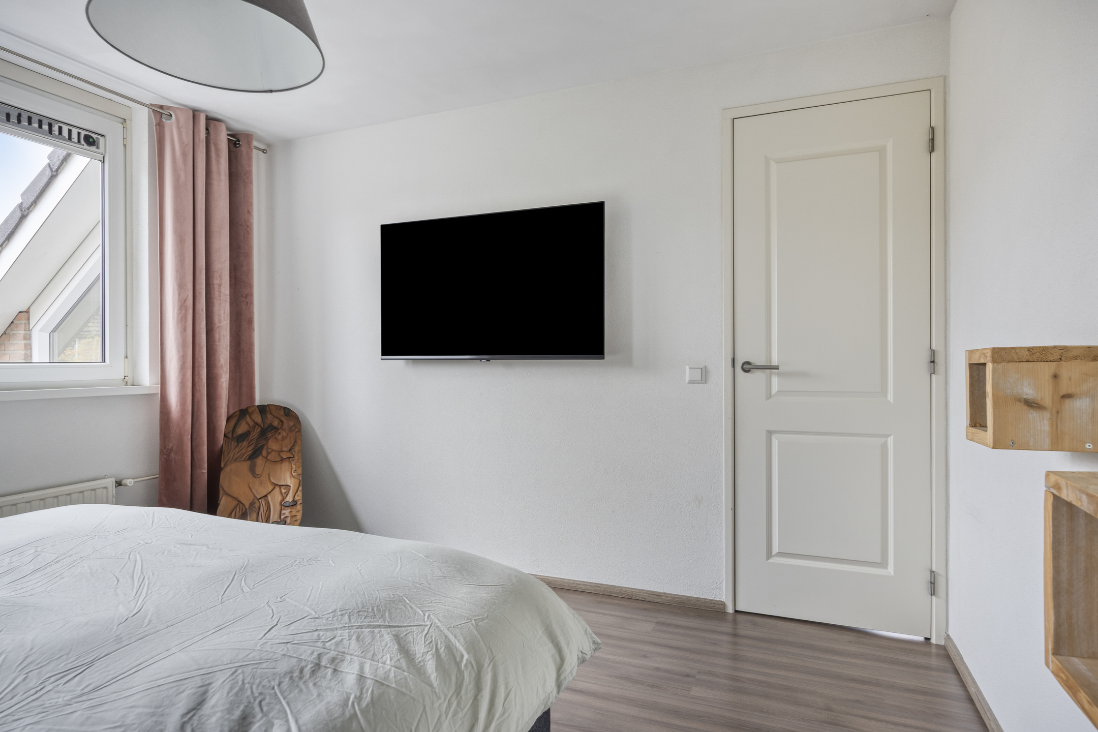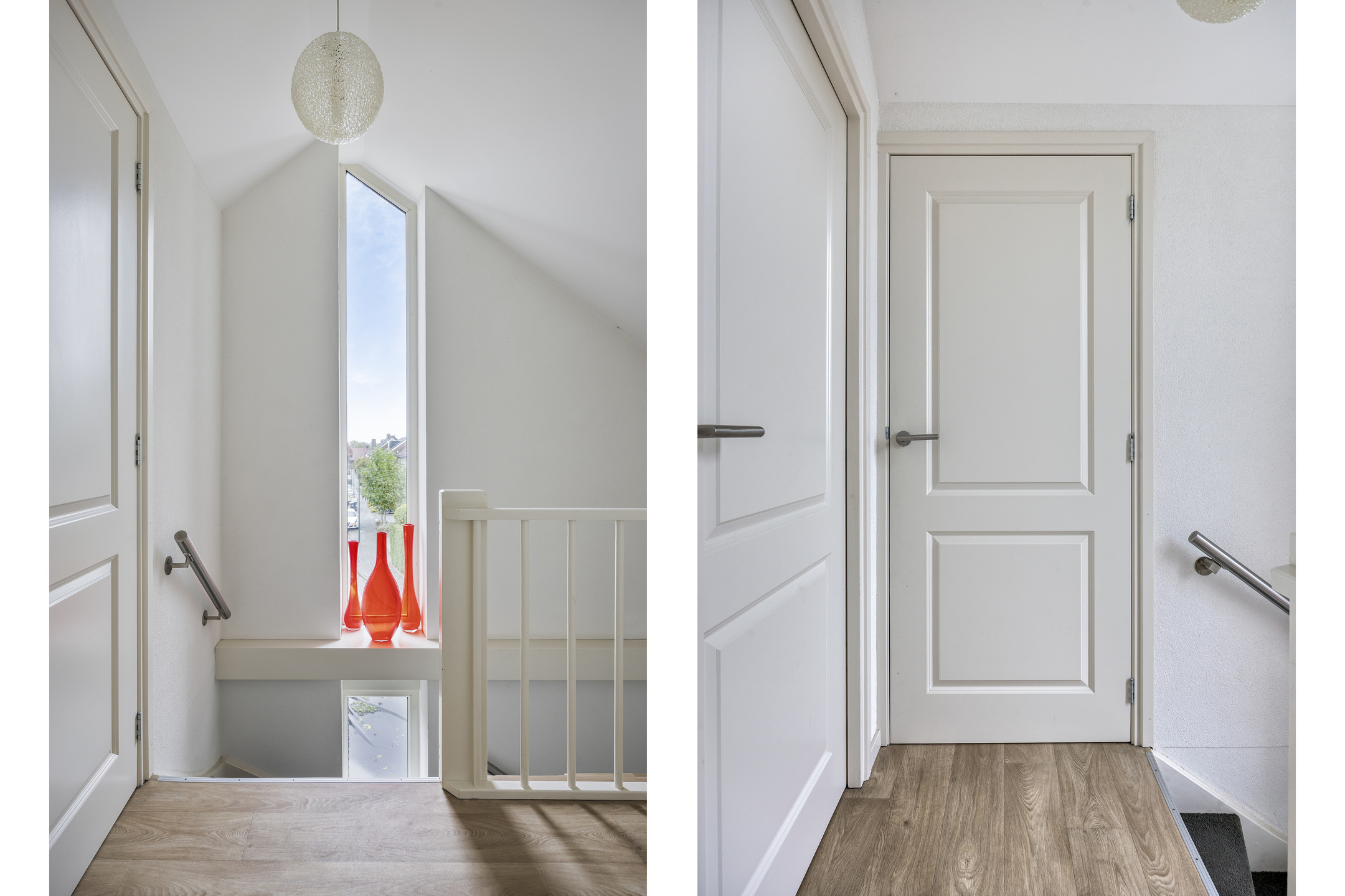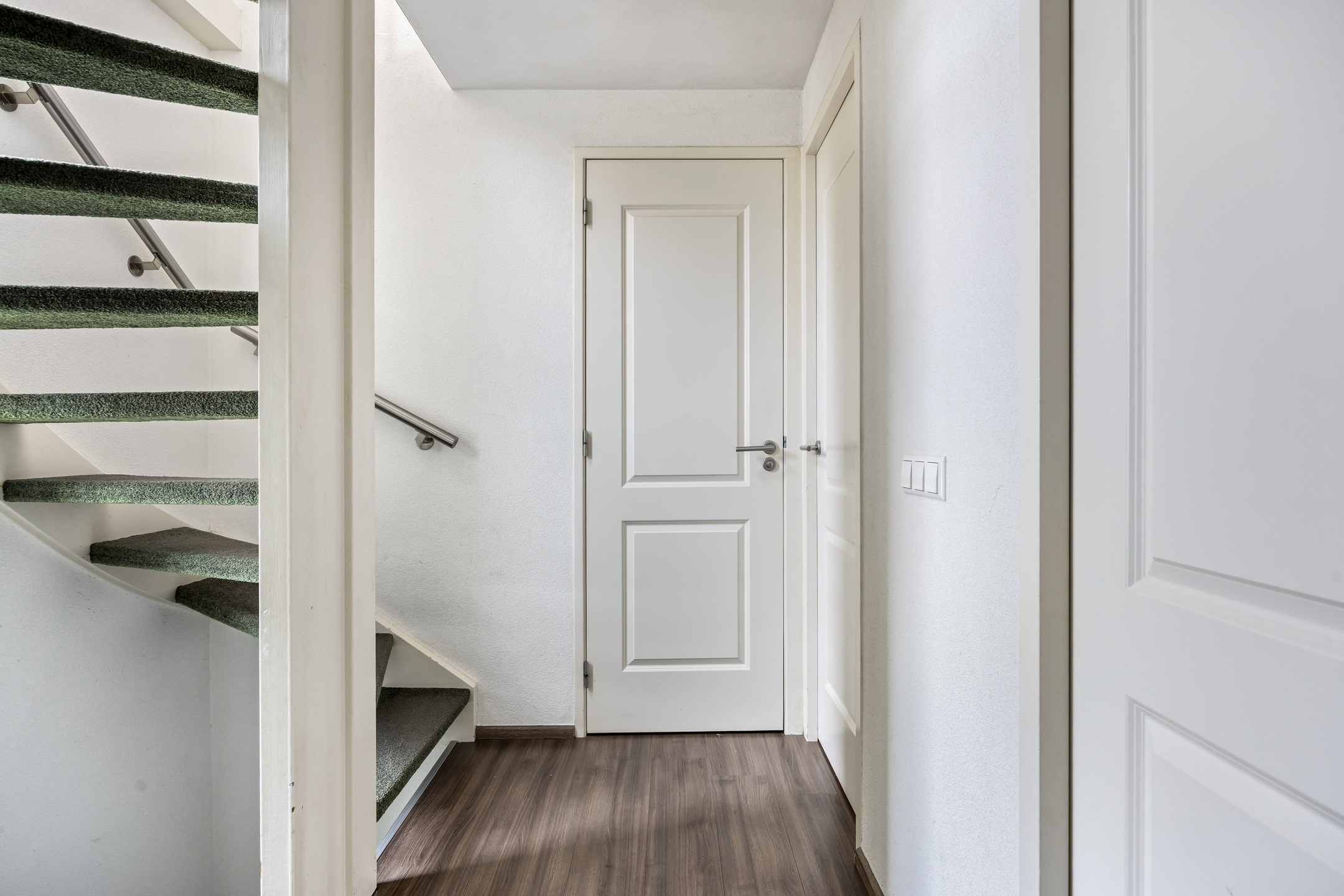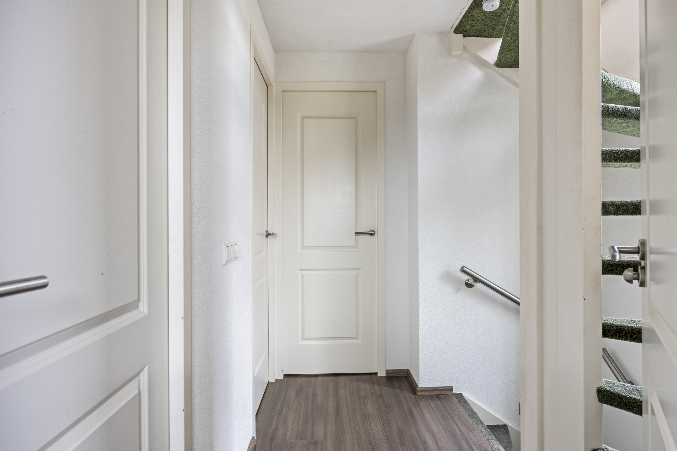 Overloop met toegang tot drie slaapkamers en de badkamer. De hoofdslaapkamer aan de achterzijde is voorzien van laminaatvloer, wanden met fijne korrel en schuurwerk plafonds. De tweede slaapkamer aan de achterzijde en de derde (voorzijde) zijn in dezelfde stijl afgewerkt.