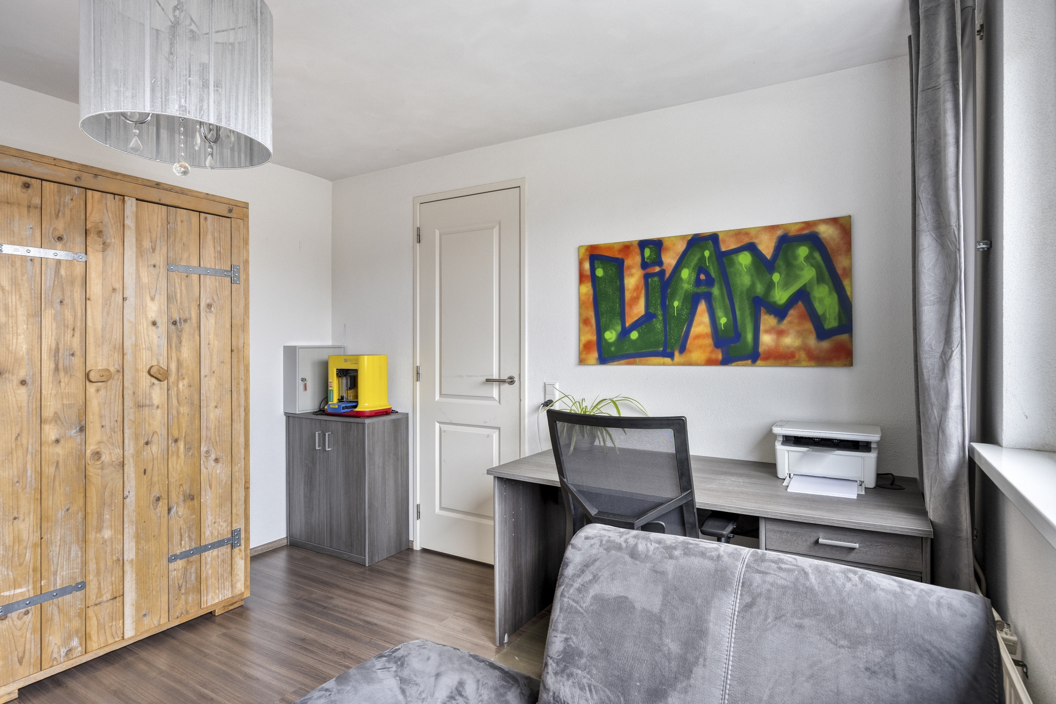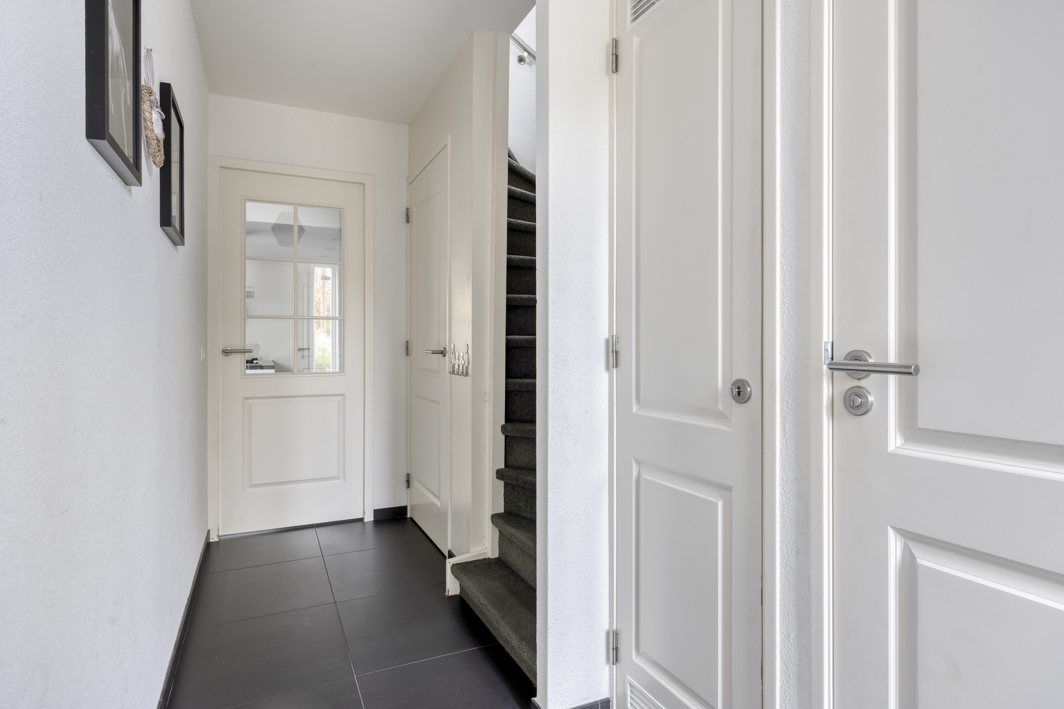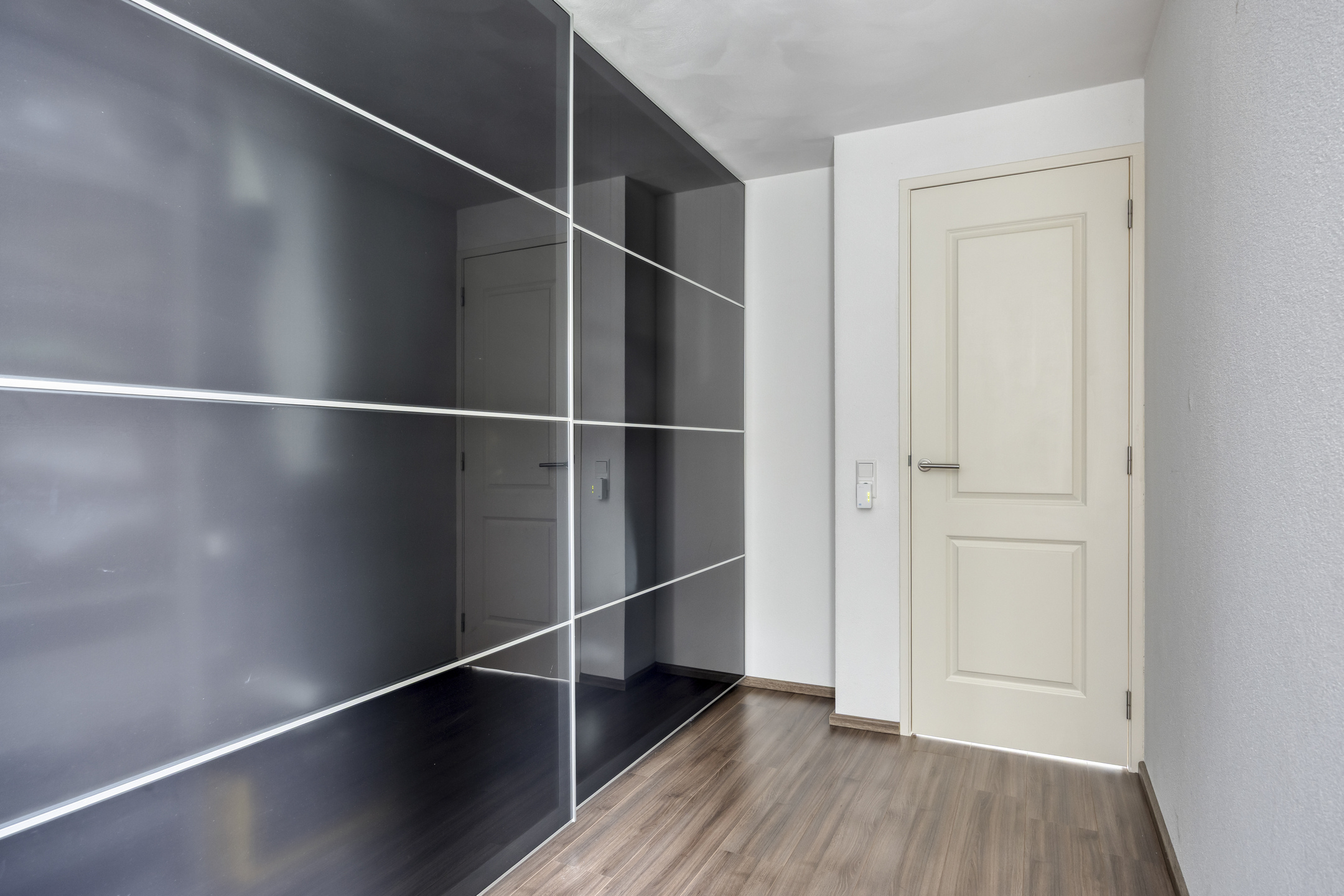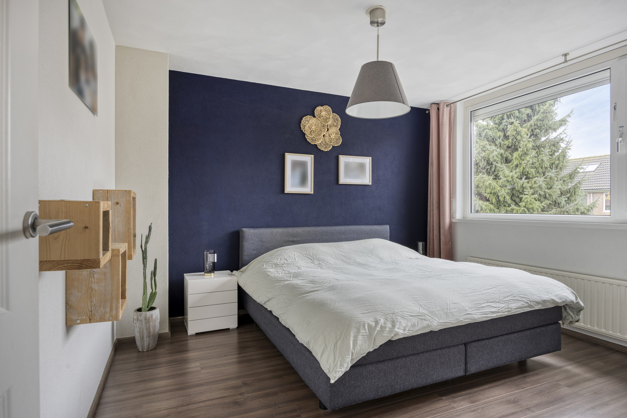Overloop met toegang tot drie slaapkamers en de badkamer. De hoofdslaapkamer aan de achterzijde is voorzien van laminaatvloer, wanden met fijne korrel en schuurwerk plafonds. De tweede slaapkamer aan de achterzijde en de derde (voorzijde) zijn in dezelfde stijl afgewerkt.