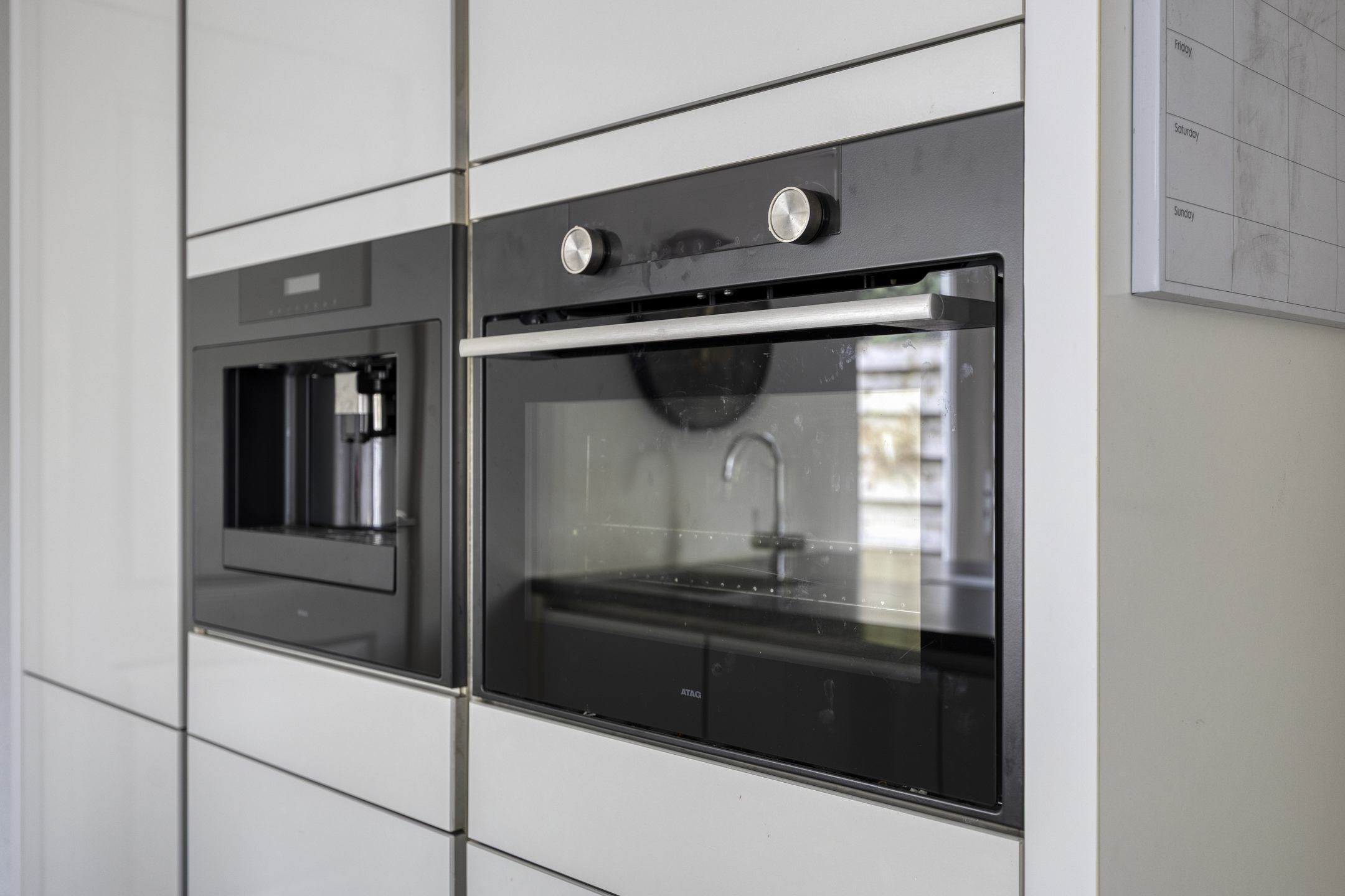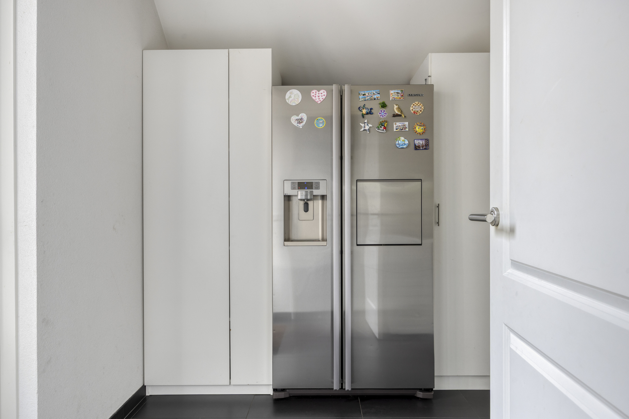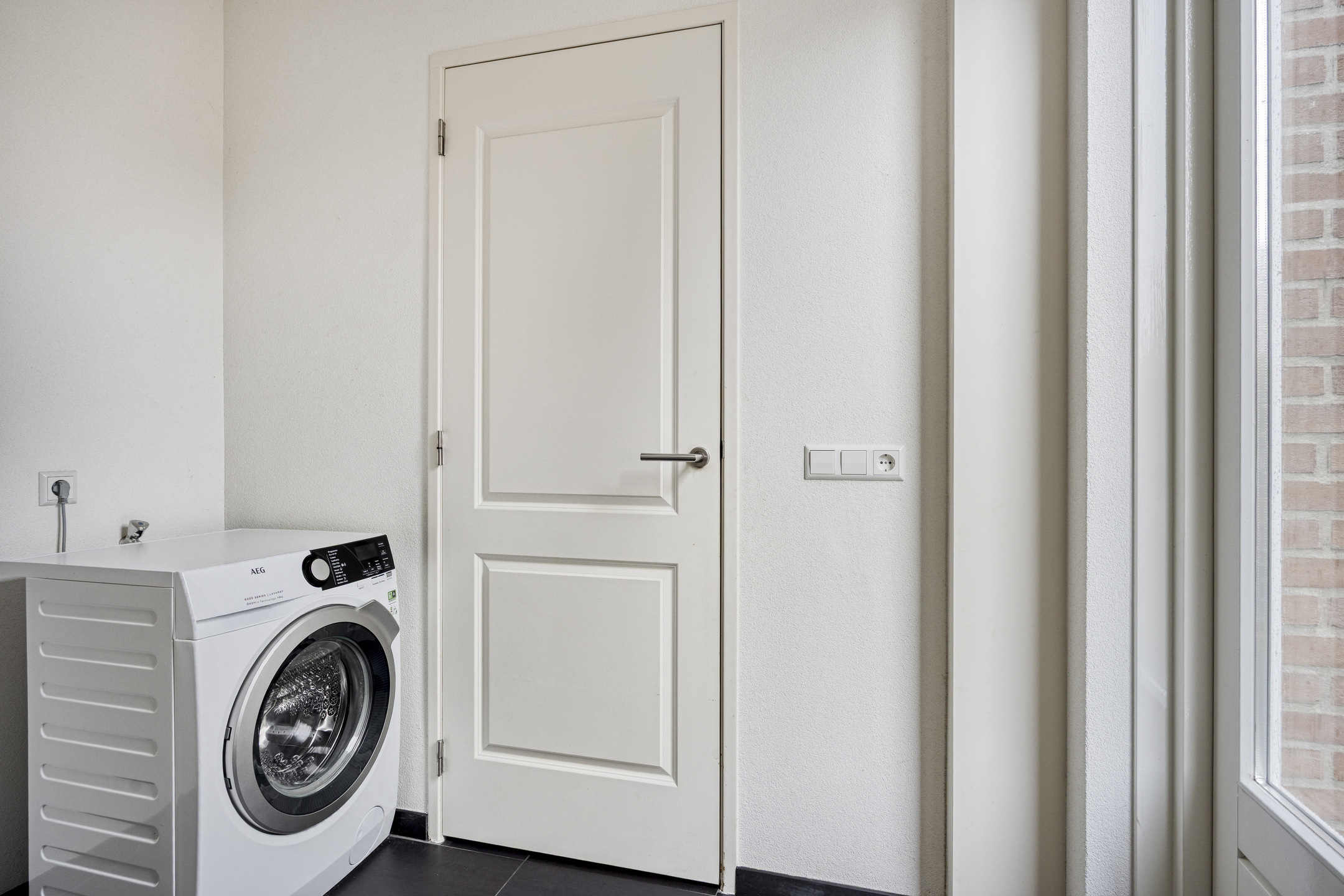 Aangrenzend een praktische bijkeuken met wasmachineaansluitingen en extra bergruimte.