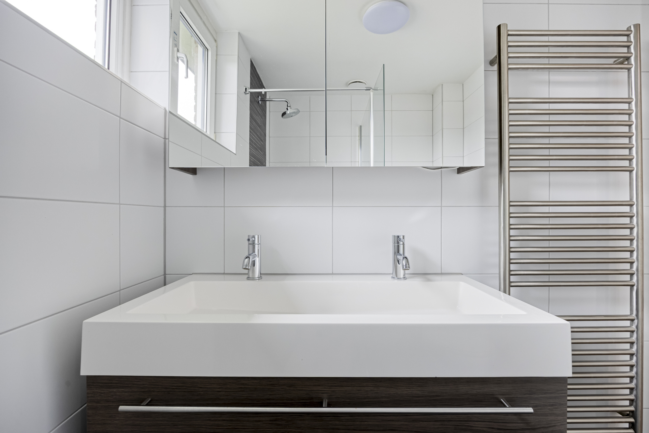 De badkamer (2011) is modern uitgevoerd en voorzien van inloopdouche, dubbel wastafelmeubel, toilet en vloerverwarming.