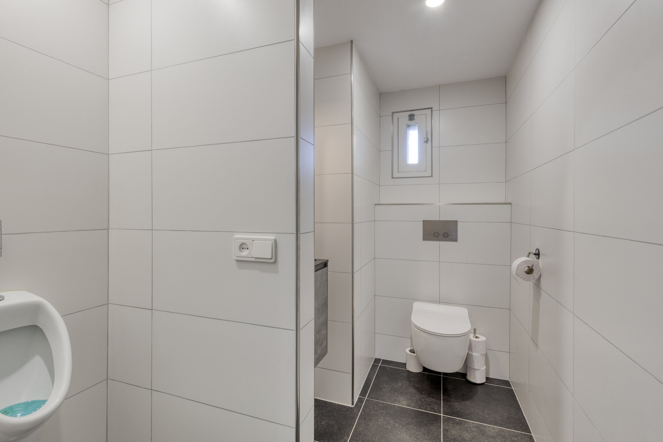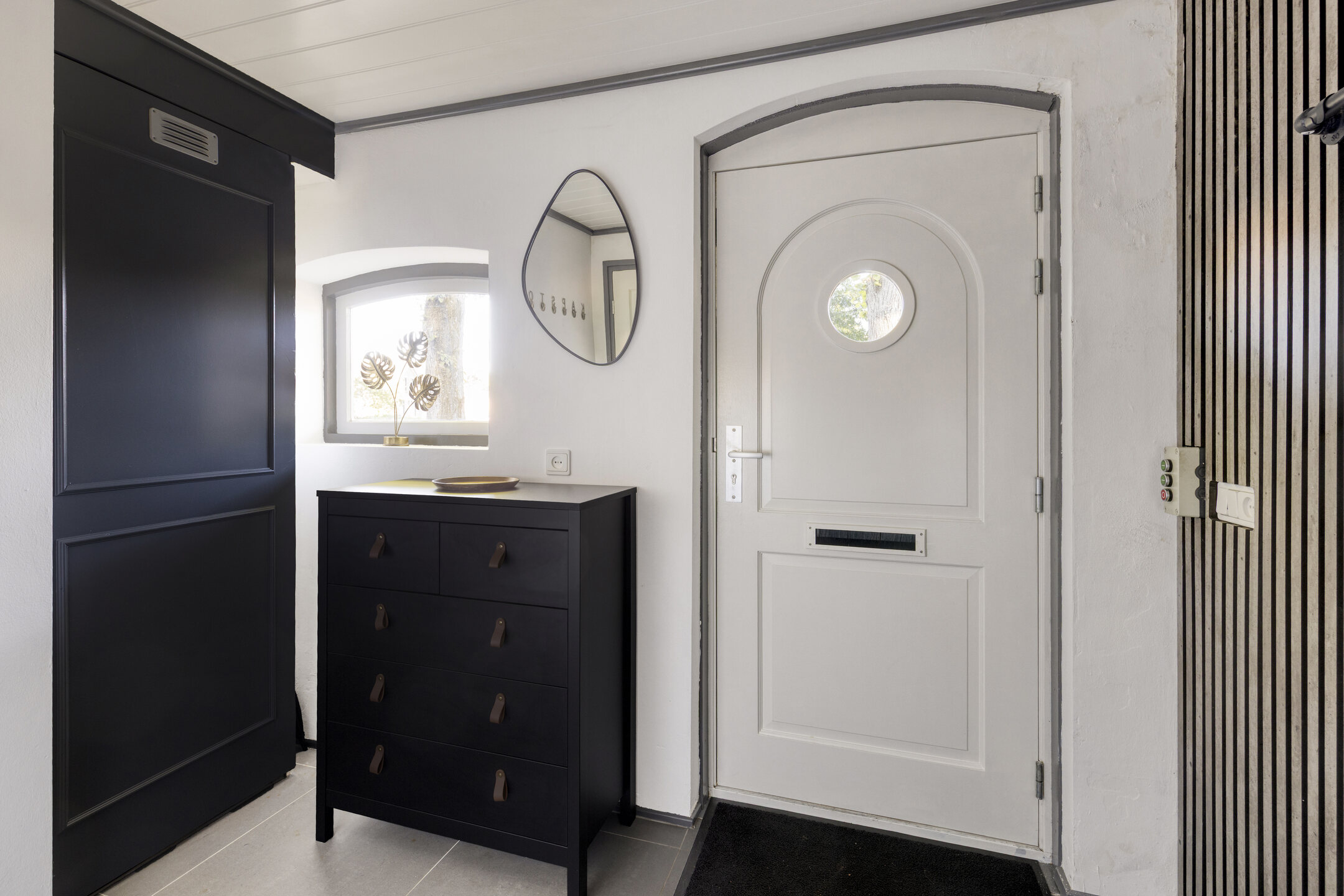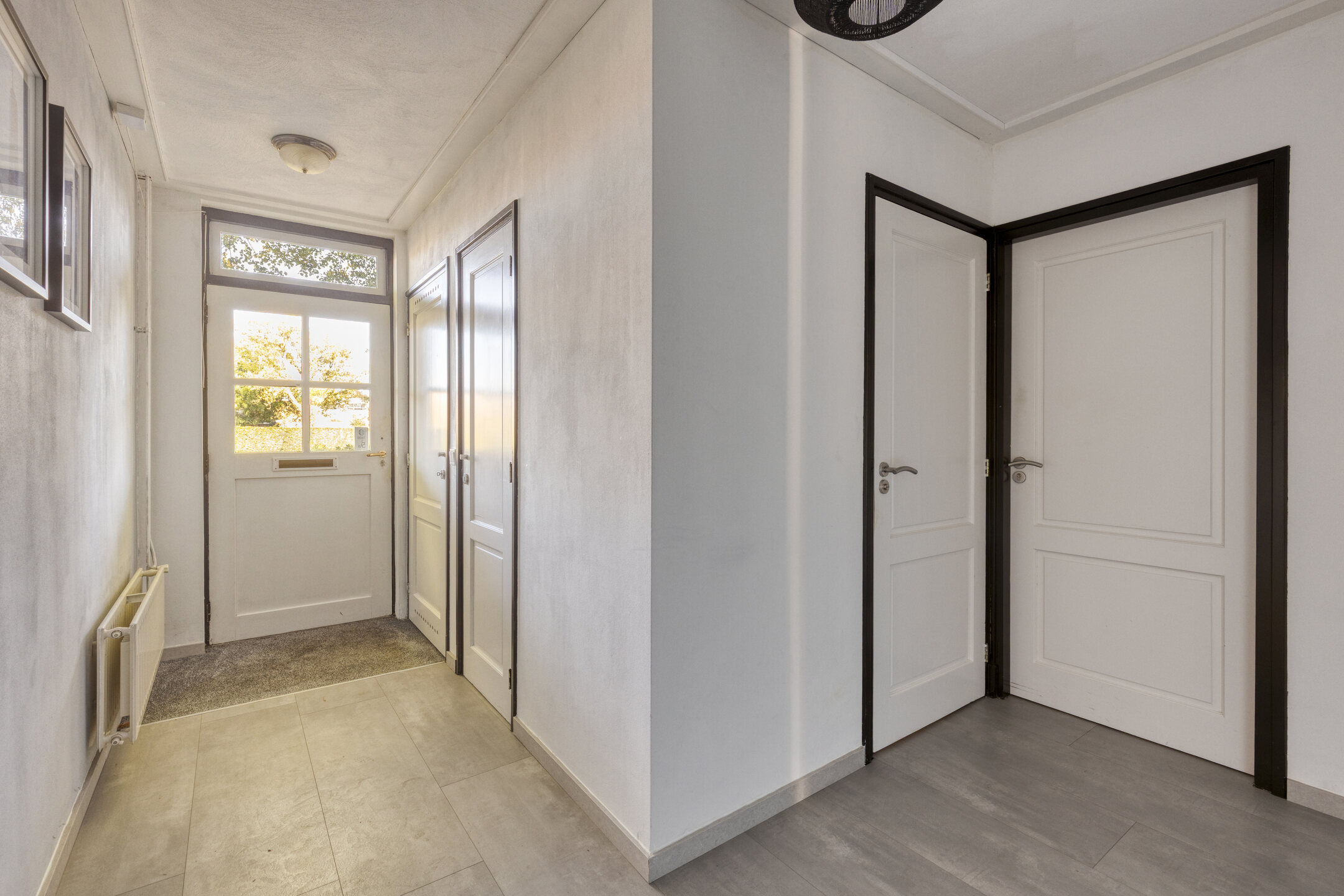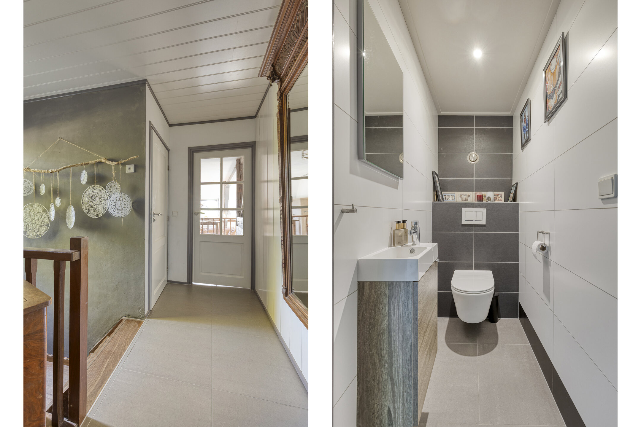 Entree/hal met trapopgang en toegang tot toilet (2017, voorzien van fontein), badkamer en woonkamer.