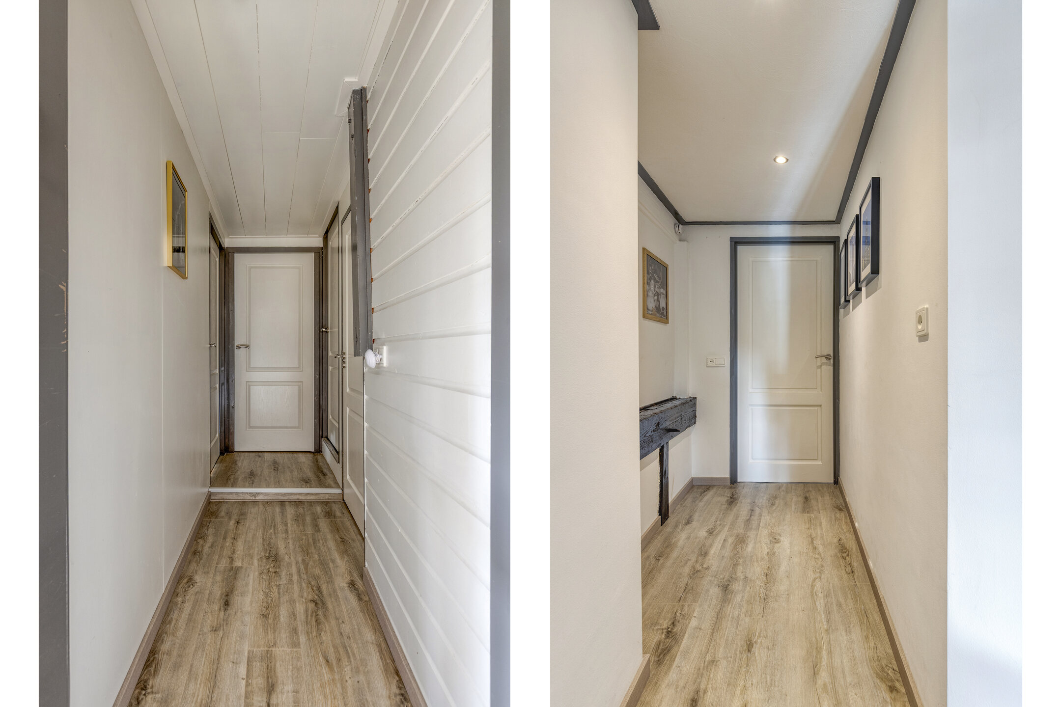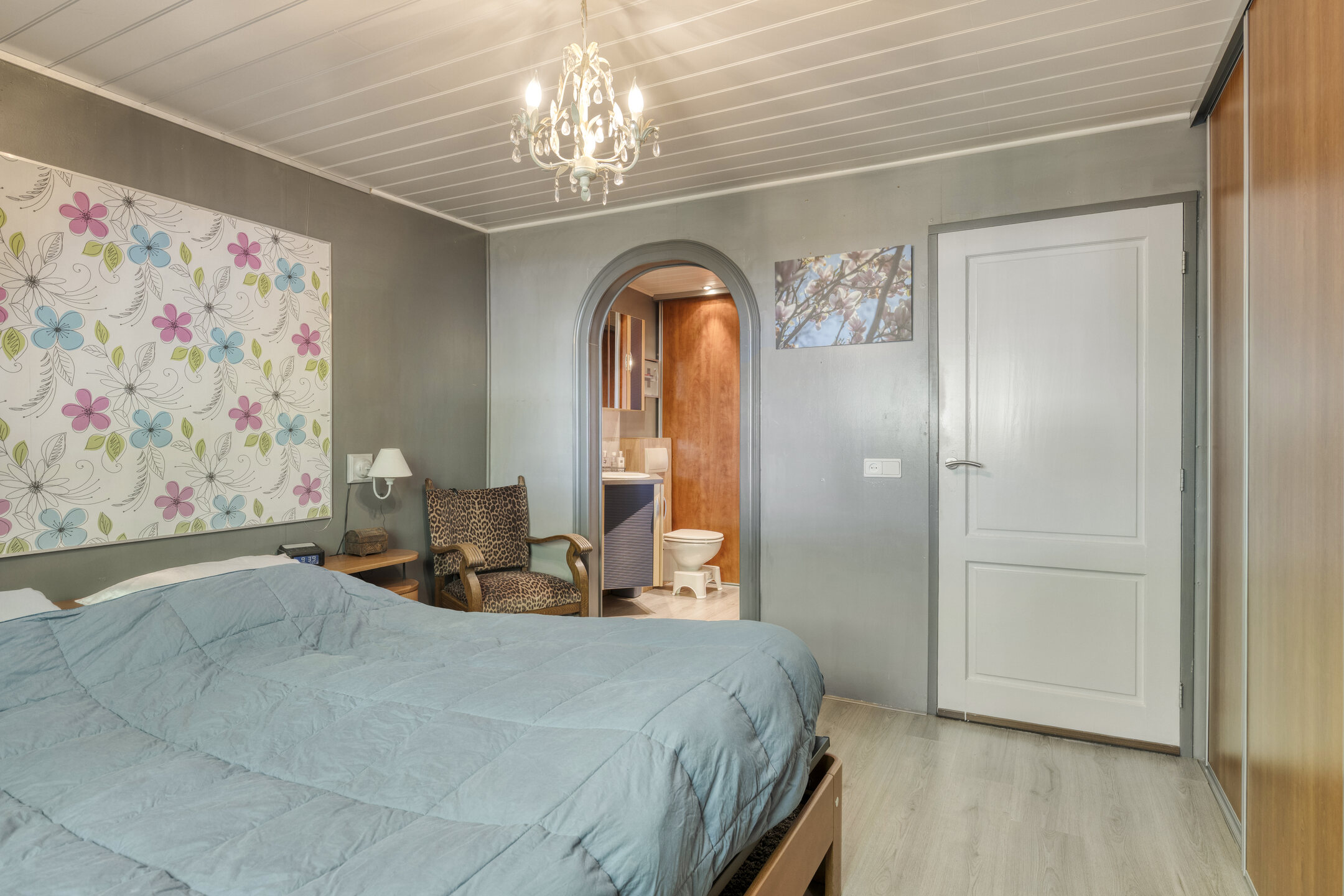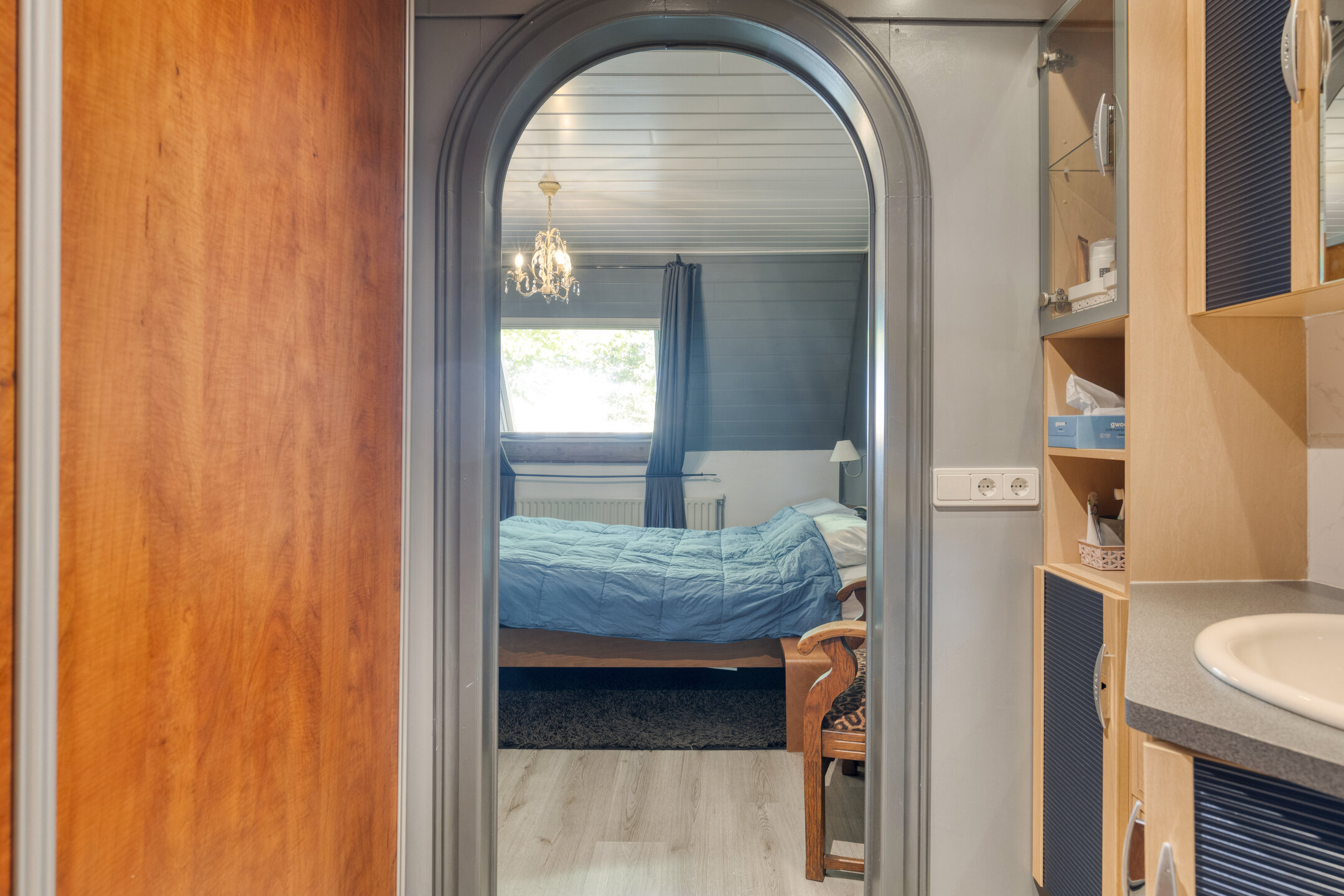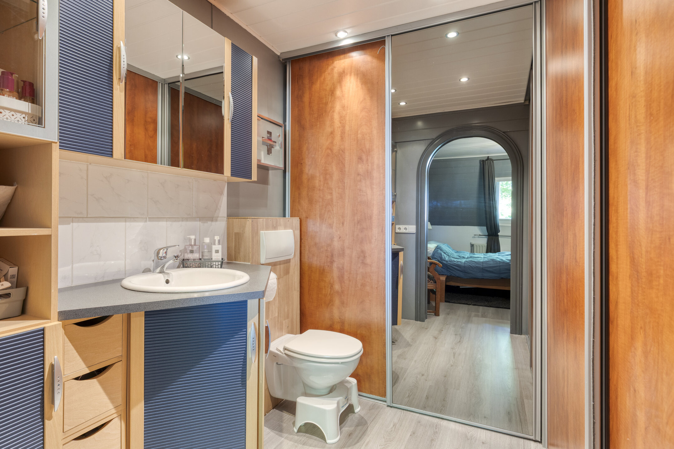 De badkamer (2017) beschikt over een sunshower, inloopdouche en dubbel wastafelmeubel. De slaapkamers zijn afgewerkt met laminaatvloeren, schrootjeswanden en -plafonds en beschikken over een wastafel.
