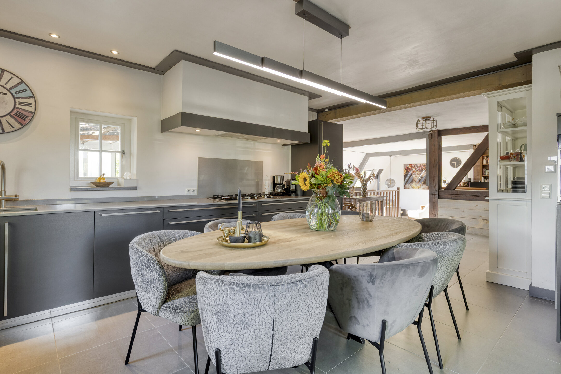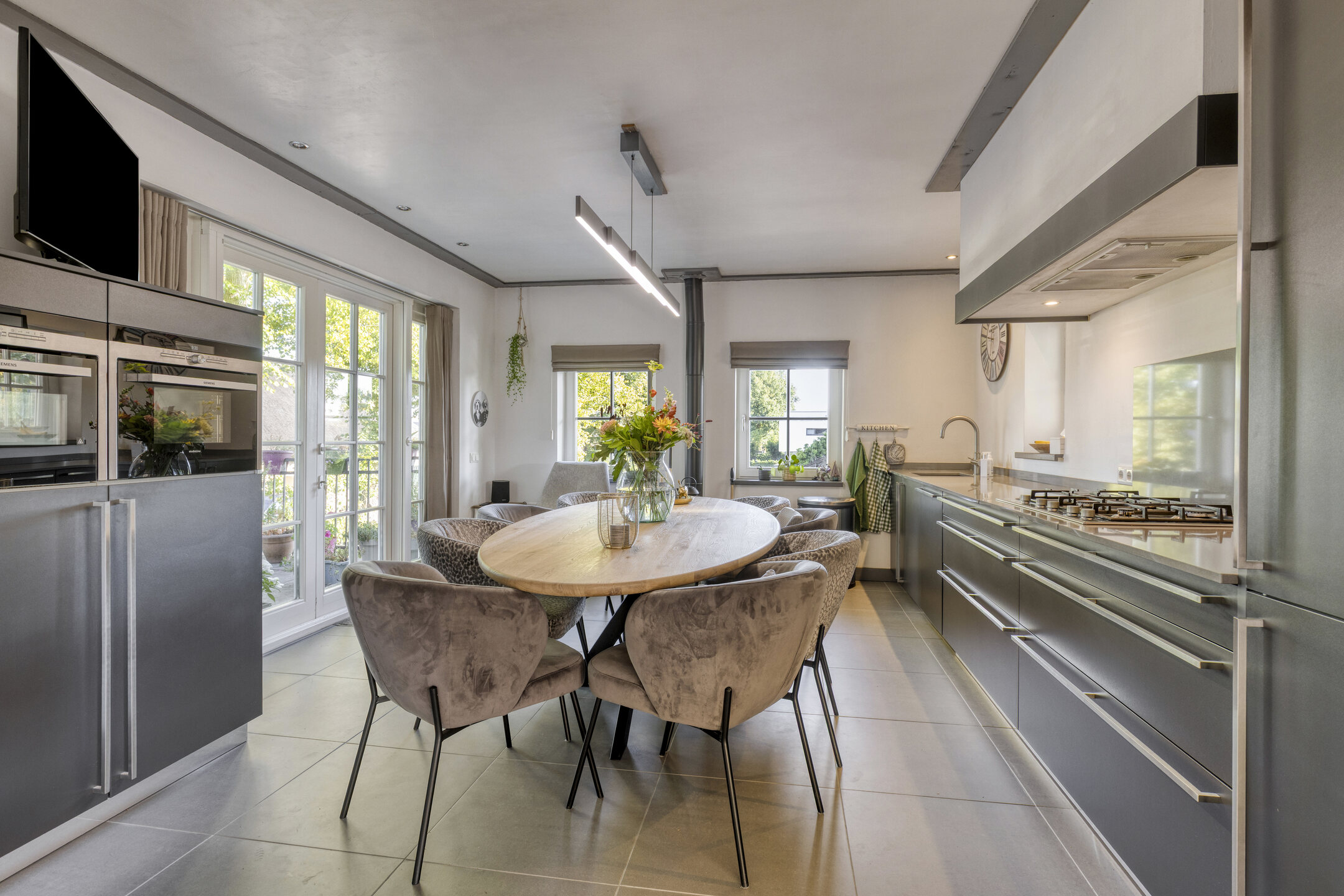 De keuken (2015) is uitgevoerd in neutrale stijl met tegelvloer en elektrische vloerverwarming, strak gestucte wanden en dubbele tuindeuren naar de tuin. Voorzien van 5-pits gaskookplaat, afzuigschouw, oven, combi-stoomoven, koelkast, vriezer, vaatwasser en Quooker.
