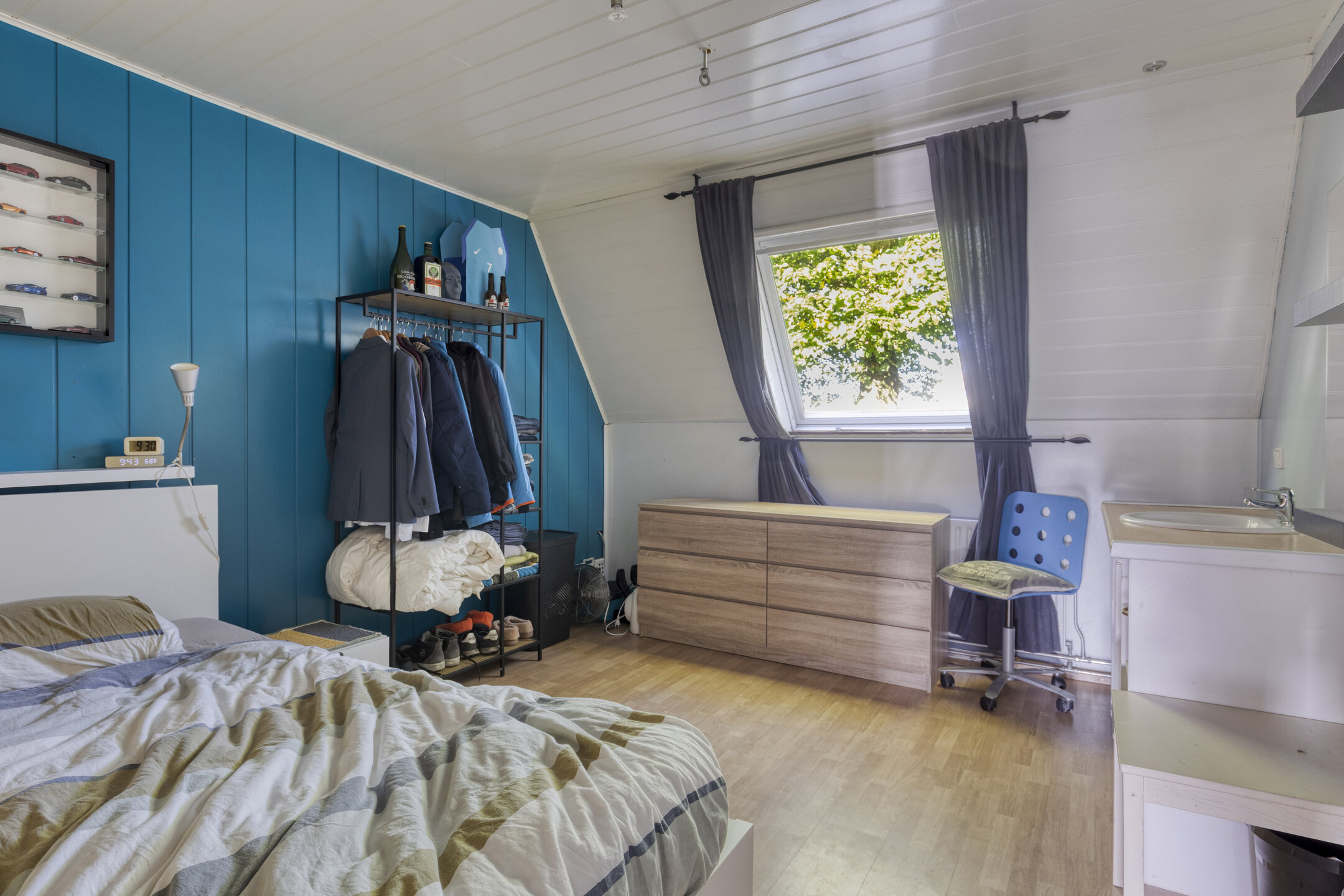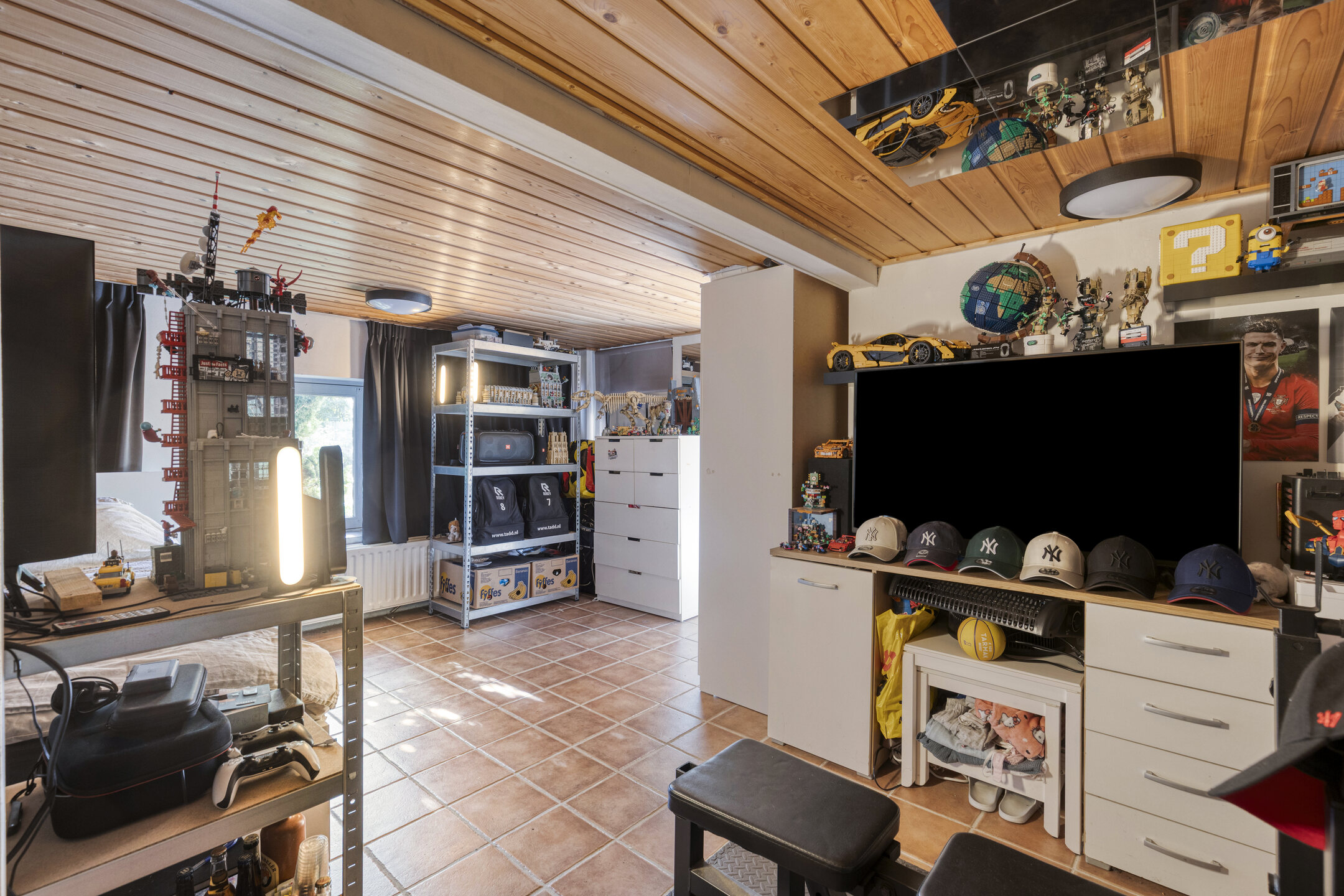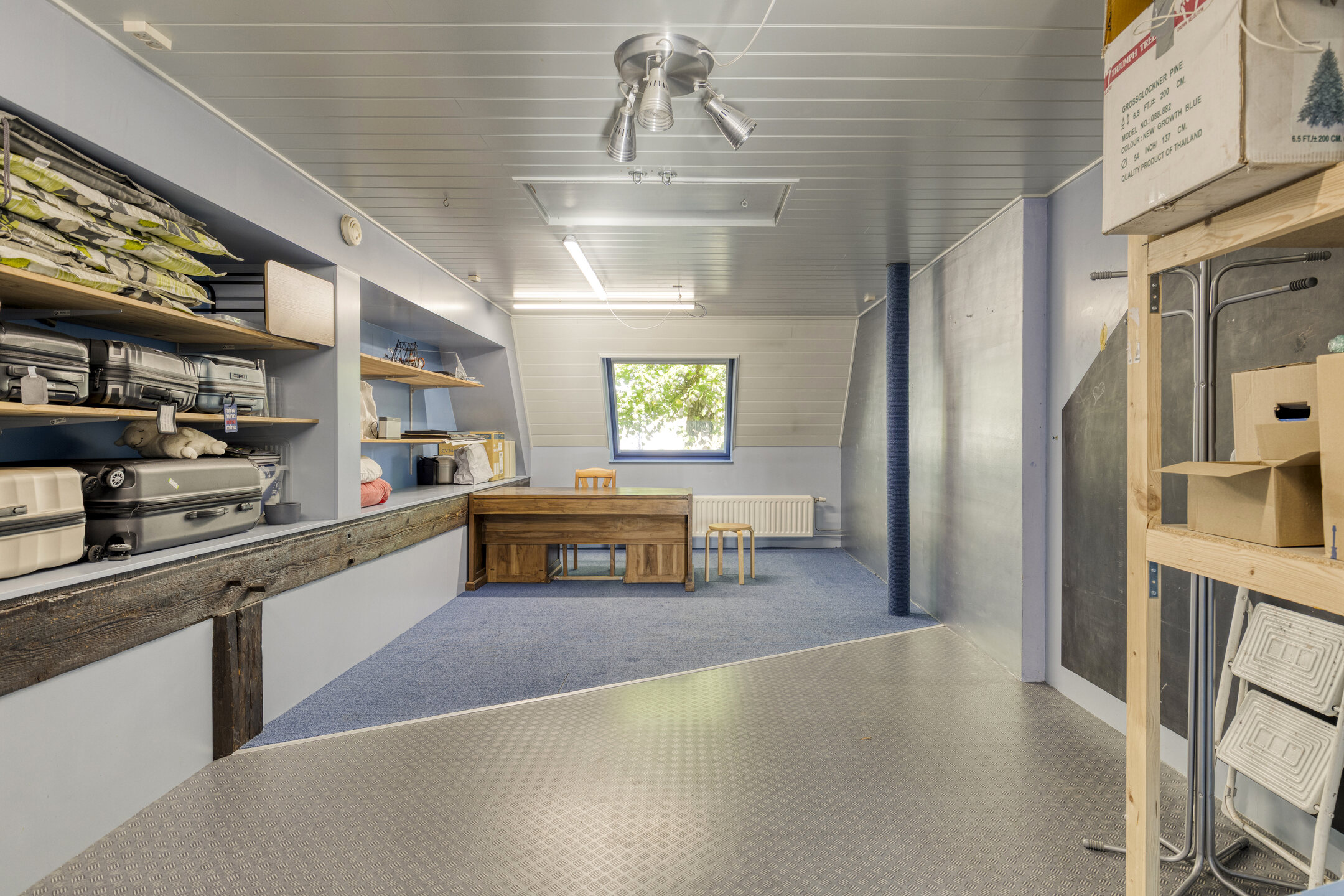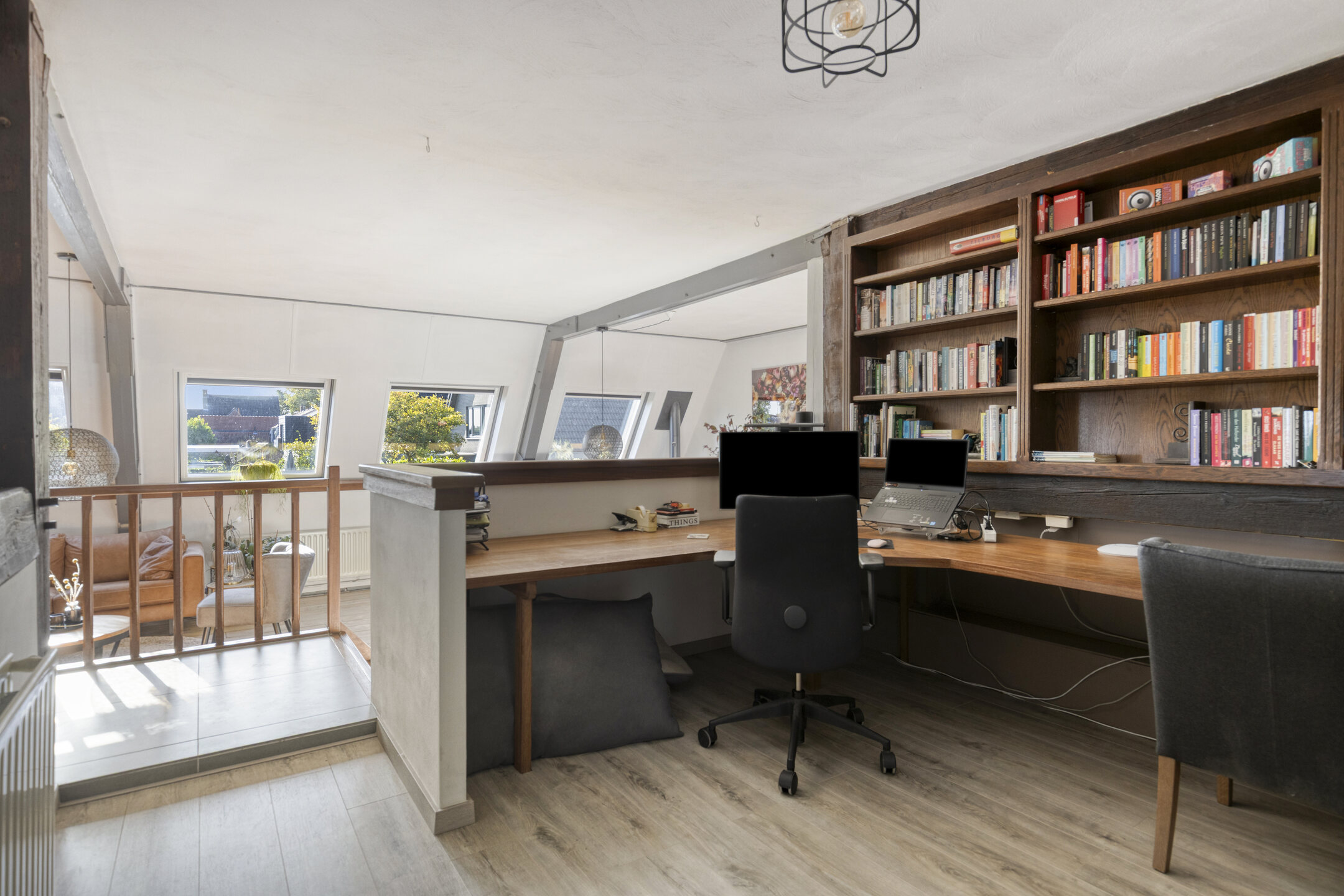 De woonkamer is ruim en licht, met dakramen, eiken houten vloer en een schuurwerk plafond. Een verhoogd gedeelte met boekenkast geeft de ruimte een speelse en karaktervolle indeling.