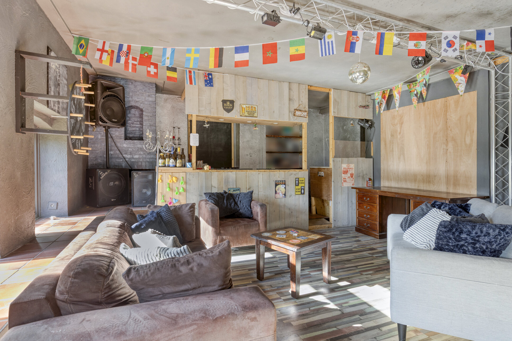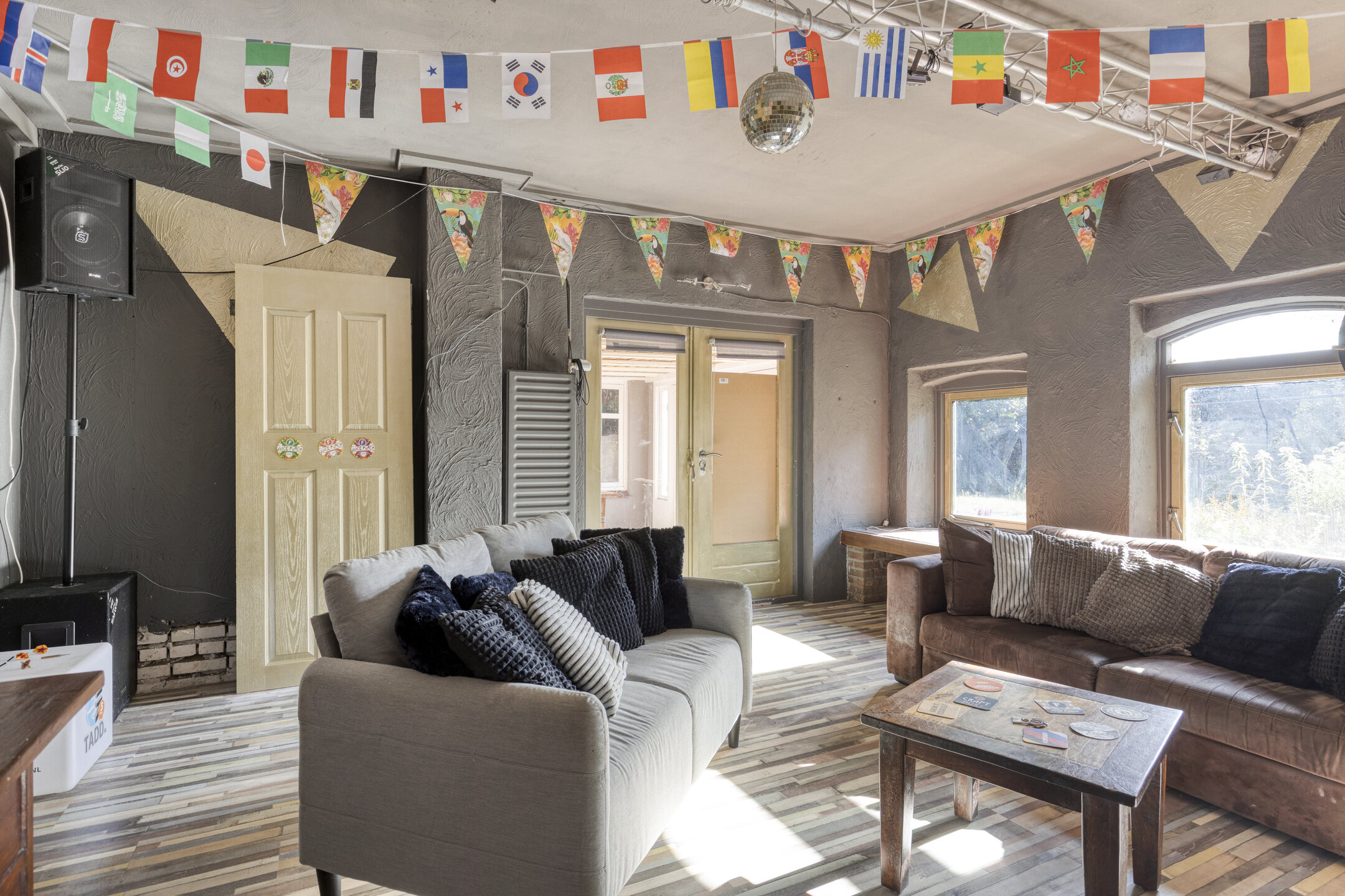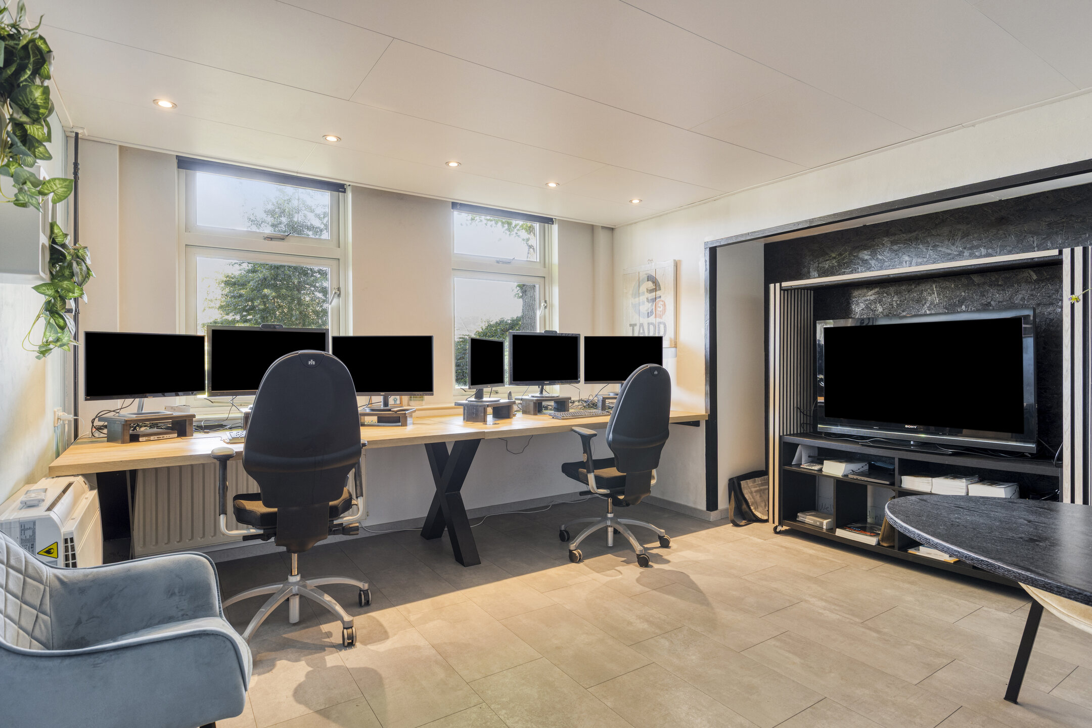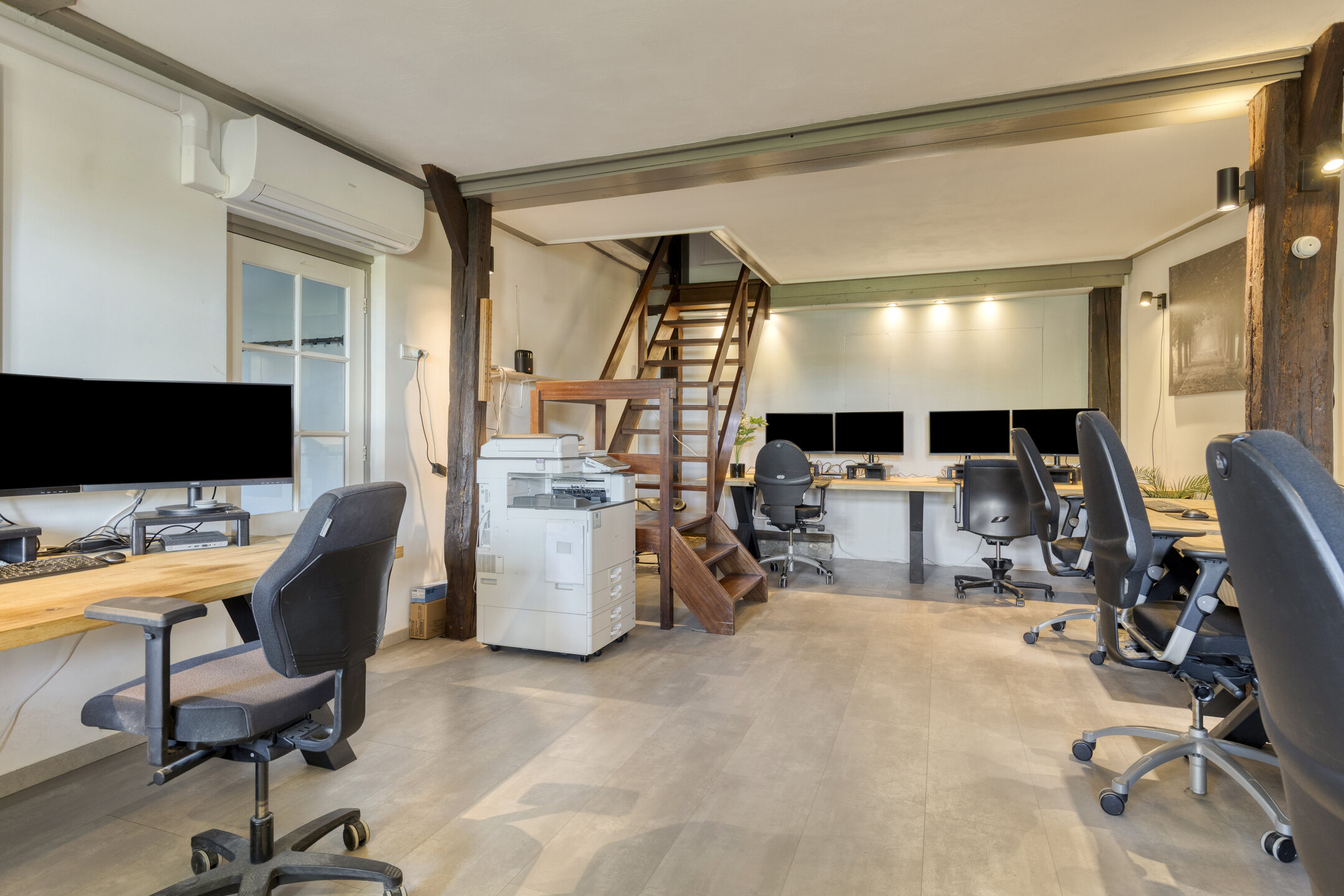 De begane grond is momenteel in gebruik als kantoorruimte, maar is eenvoudig om te bouwen naar een volwaardige woonlaag met woonkamer, keuken en leefruimte. Daarnaast zijn er al diverse voorzieningen aanwezig, zoals een badkamer, een slaapkamer, een bar, een tuinkamer en een berging.